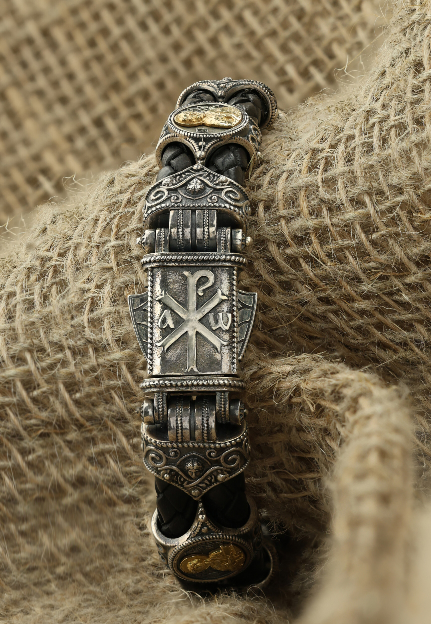 Браслет из серебра и золота c кожаным шнурком и ониксом