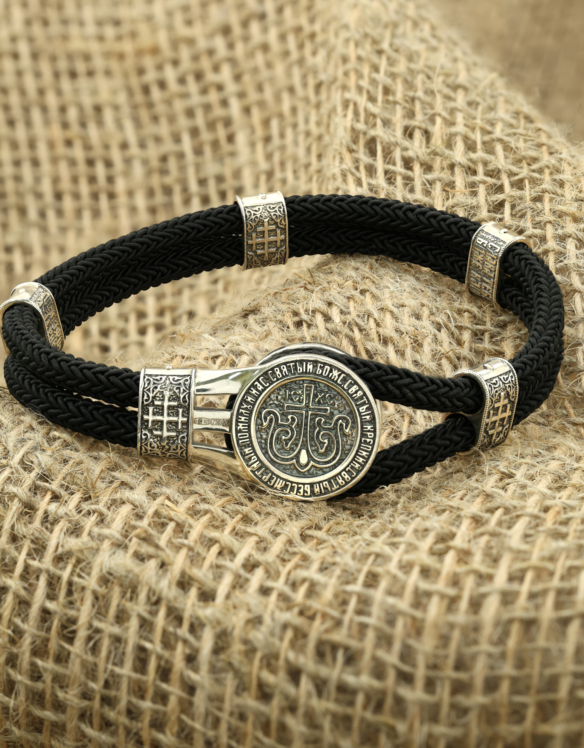 Браслет из серебра и золота c ониксом и шёлковым шнурком