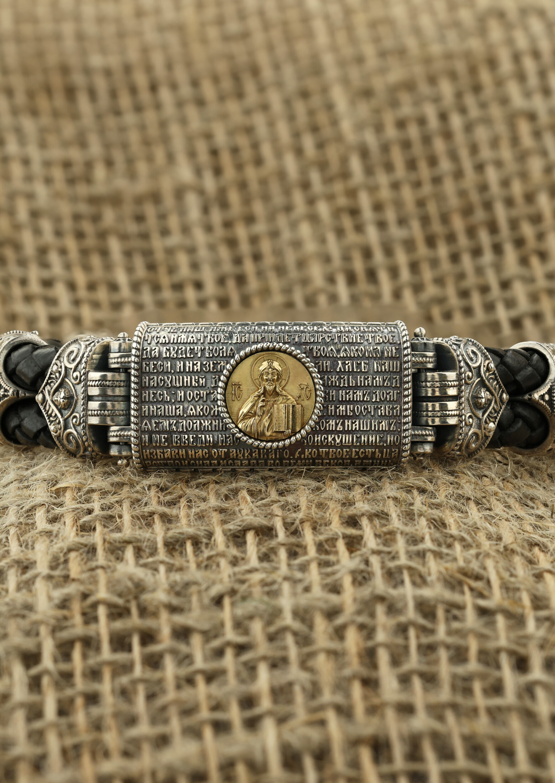 Браслет из серебра и золота c кожаным шнурком