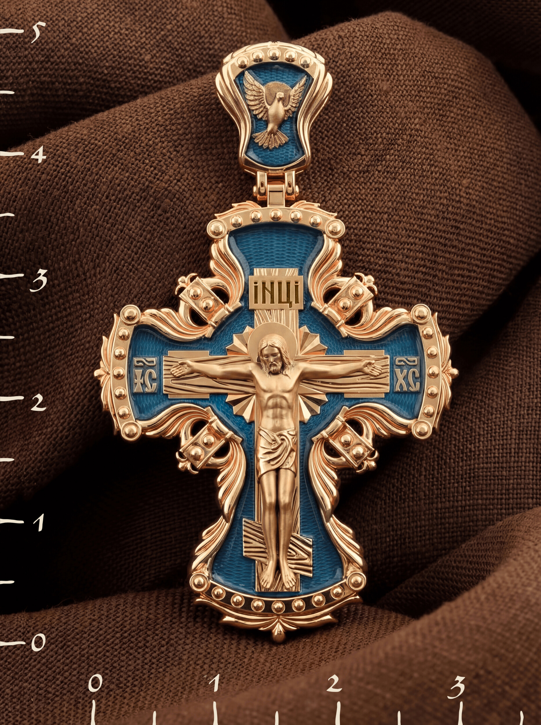 Центральную часть лицевой стороны занимает Распятие Христа — образ жертвы, принесенной Господом за грехи людей. Именно ко Христу, сошедшему на землю ради нашего спасения, возносятся все молитвы. Рядом с Его образом помещены слова — «НИКА» и «СЫН БОЖИЙ». Эти слова характеризуют Господа как Великого Архиерея, победителя смерти. Также Распятие сопровождается надписями, олицетворяющими Христа — это святое имя Христа «IC» (Иисус) «ХС» (Христос). На кулонном кольце изображен голуь — символ Святого Духа.