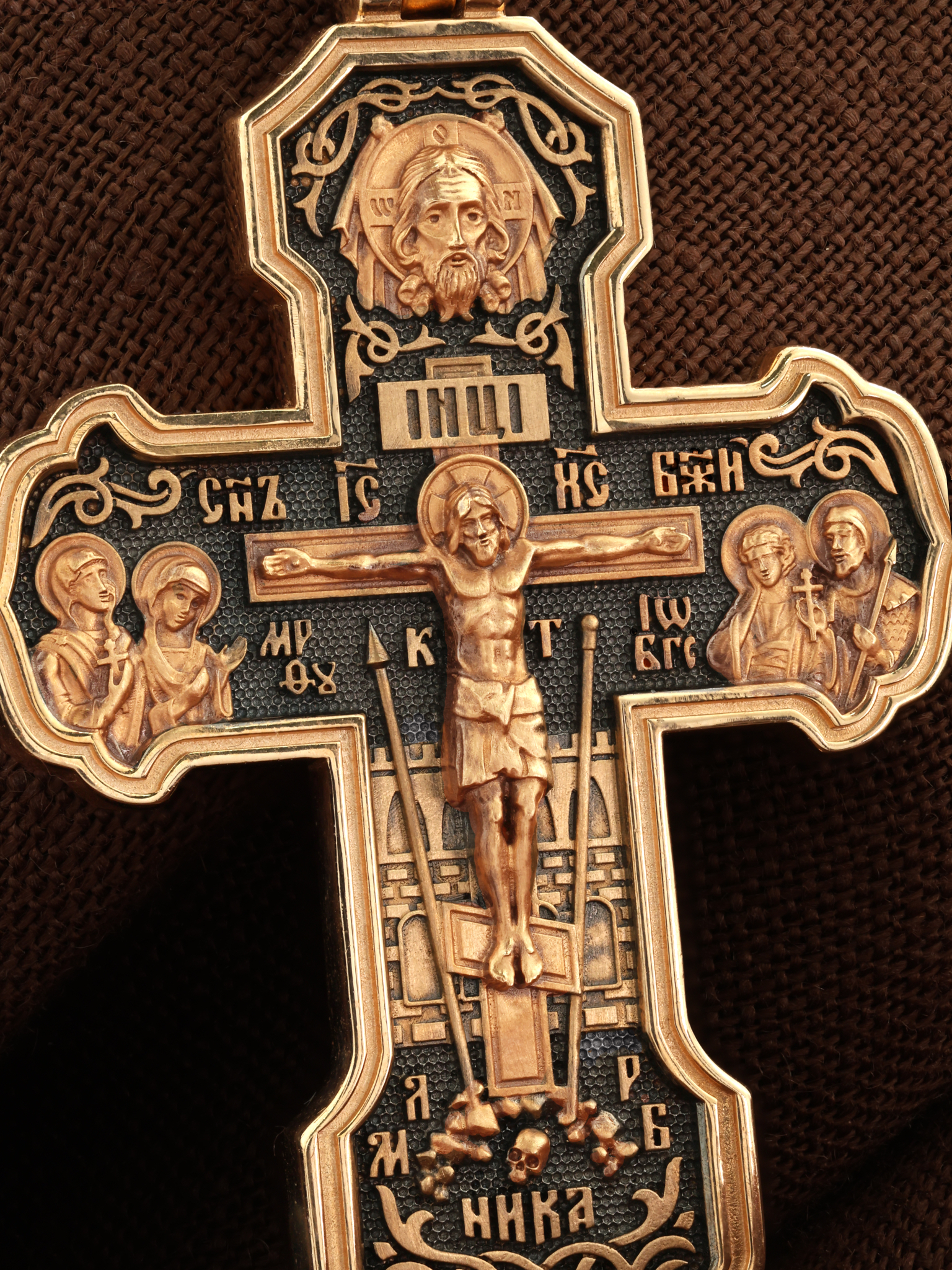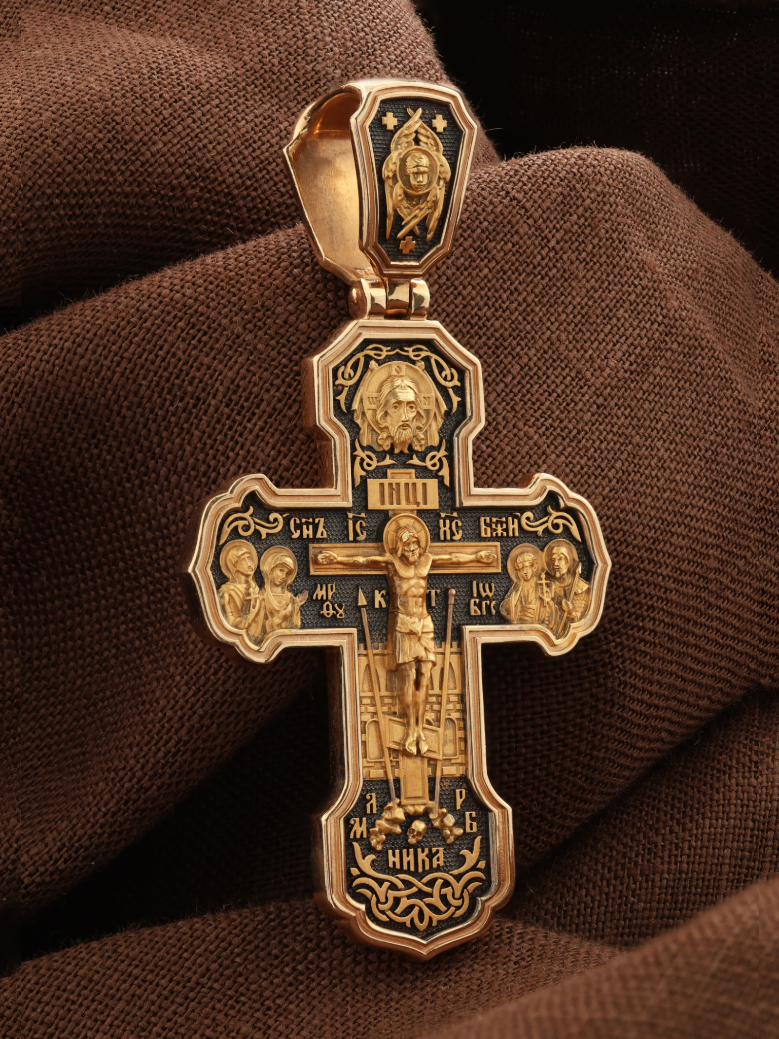 На лицевой стороне креста изображено Распятие Господа и Спасителя нашего Иисуса Христа. Крест- символ спасения и искупления рода человеческого, знамение победы над смертью и адом. Иисус Христос, как искупительная жертва освобождения человечества от власти греха, умер крестной смертью и в третий день воскрес. На верхней табличке, выше головы Иисуса, расположена надпись, составленная Понтием Пилатом — «IНЦI». Она означает «Иисус Назорей, Царь Иудейский». Надпись «IС» « ХС» означает Иисус Христос и помещается на разных сторонах поперечной (большой) перекладины креста. Рядом расположена надпись «Сын Божий». Выше Распятия изображен Нерукотворный образ Господа и Спасителя нашего Иисуса Христа. Слева от Распятия — Пресвятая Богородица и святая мироносица Мария Магдалина с крестом в руке. Справа — апостол и евангелист Иоанн Богослов, один из ближайших учеников Иисуса Христа и сотник Лонгин с крестом в правой руке и копьем — в левой. За крестом высится Иерусалимская стена. Крест стоит на горе камней, символизирующих Голгофу. В ее основании различается череп — это голова Адама. Вдоль креста изображены копие сотника Лонгина и трость с губкой и буквы «К» и «Т». Надпись «МЛРБ» — «место лобное рай бысть» означает, что место лобное стало раем и помещаются в нижней части креста. Рядом — слово «НИКА», что означает «победитель». На православном кресте Христос не умирает, а свободно простирает руки, ладони Иисуса открыты, будто он хочет обнять все человечество, даря им свою любовь и открывая путь к вечной жизни. На кулонном кольце изображен шестикрылый Серафим.