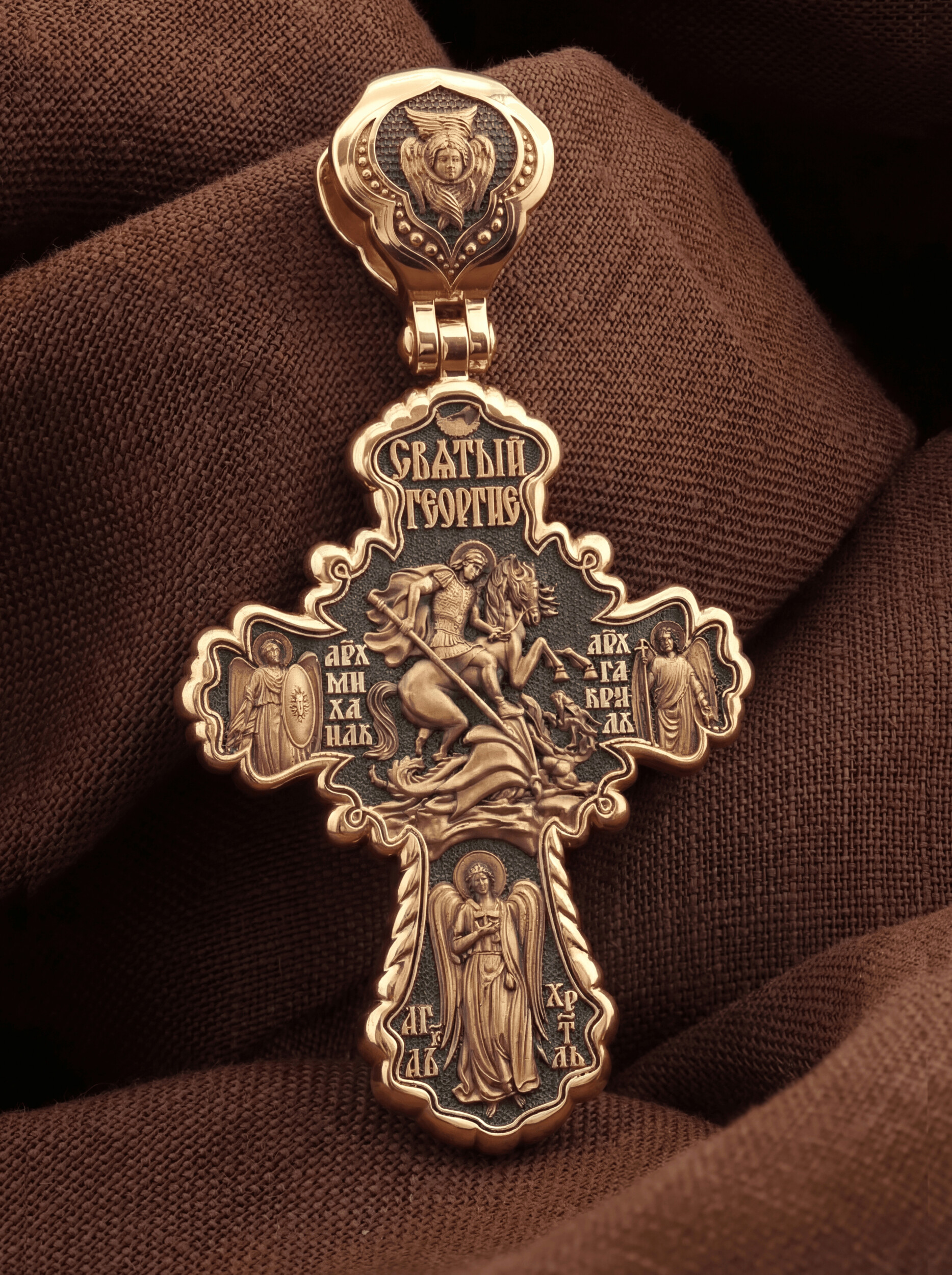 В центре оборотной стороны креста помещено изображение Святого Великомученика Георгия Победоносца. Он изображен как воитель, сидящий на вздыбленном коне и поражающий копьем огнедышащего змея. Змей символизирует собою сатанинские силы. Молитвами вознесенными к Всевышнему и своей непреклонной верой он смог одолеть чудовище. Святой убил змея, спас царскую дочь, принесенную в жертву, и жителей города, их души от влияния дьявола, породив в них надежду и веру в Господа, призывая людей принять христианскую веру. Слева от Святого Георгия изображен Архистратиг Михаил, справа — Архангел Гавриил. Ниже помещен образ Ангела Хранителя. На кулонном кольце изображен шестикрылый Ангел — Серафим.