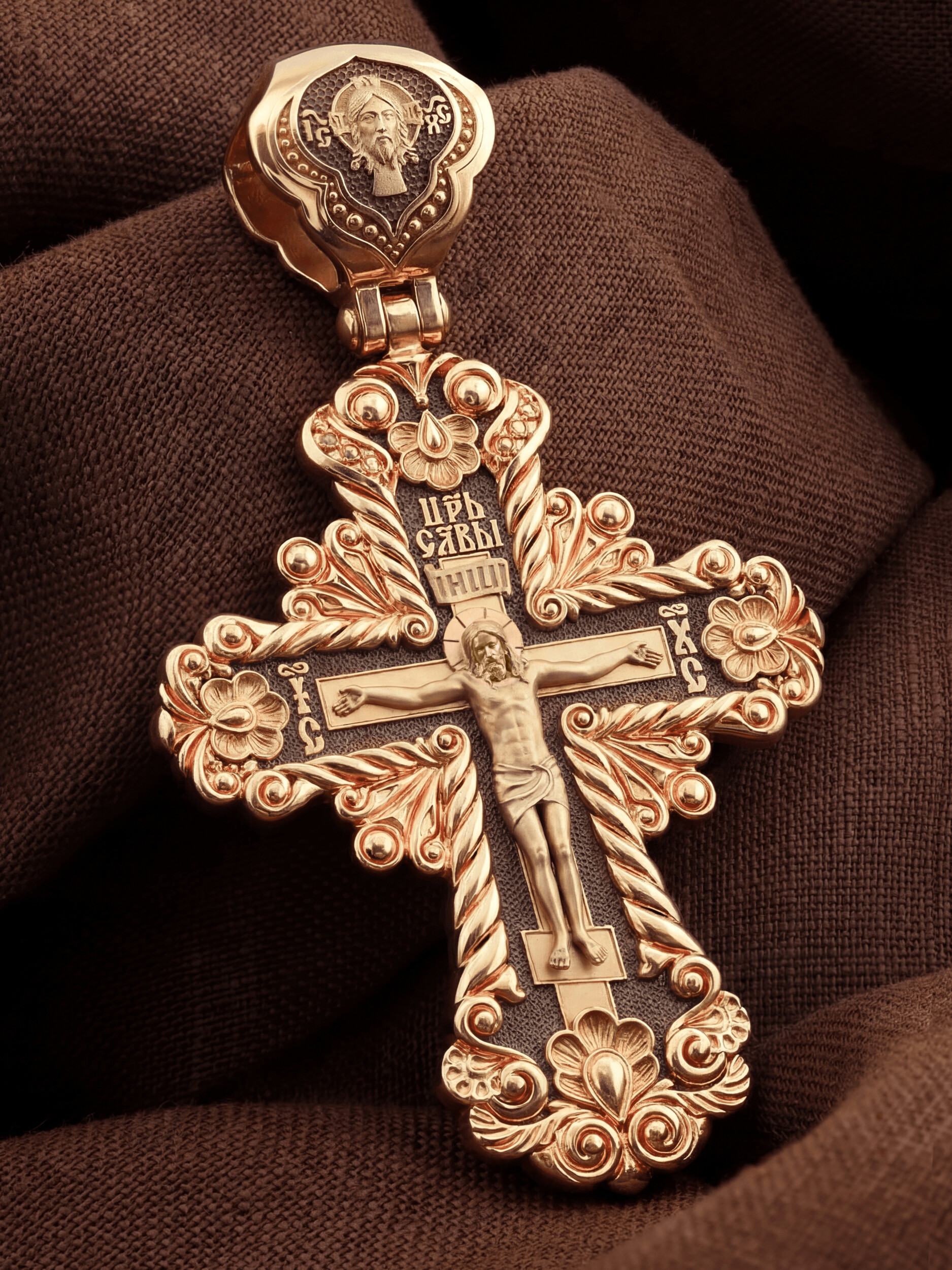 На лицевой стороне креста изображено Распятие Господа и Спасителя нашего Иисуса Христа, отдавшего Себя на смерть, для искупления грехов мира. Крест является символом жертвенной любви Всеблагого Бога к падшим людям, всепобеждающим духовным оружием христиан, основанием и средоточием церковной жизни. Господь сказал: кто хочет идти за Мною, отвергнись себя, и возьми крест свой, и следуй за Мною. (Мк. 8: 34). Над Распятием помещена надпись «Царь Славы». На верхней табличке, выше головы Иисуса, расположена надпись, составленная Понтием Пилатом — «IНЦI». Она означает «Иисус Назорей, Царь Иудейский». Надпись «IC» «ХC», означает Иисус Христос, помещается на разных сторонах поперечной перекладины креста. На кулонном кольце изображен Нерукотворный образ Господа и Спасителя нашего Иисуса Христа, чудесно отпечатавшийся на плате, которым Христос вытер свой лик.