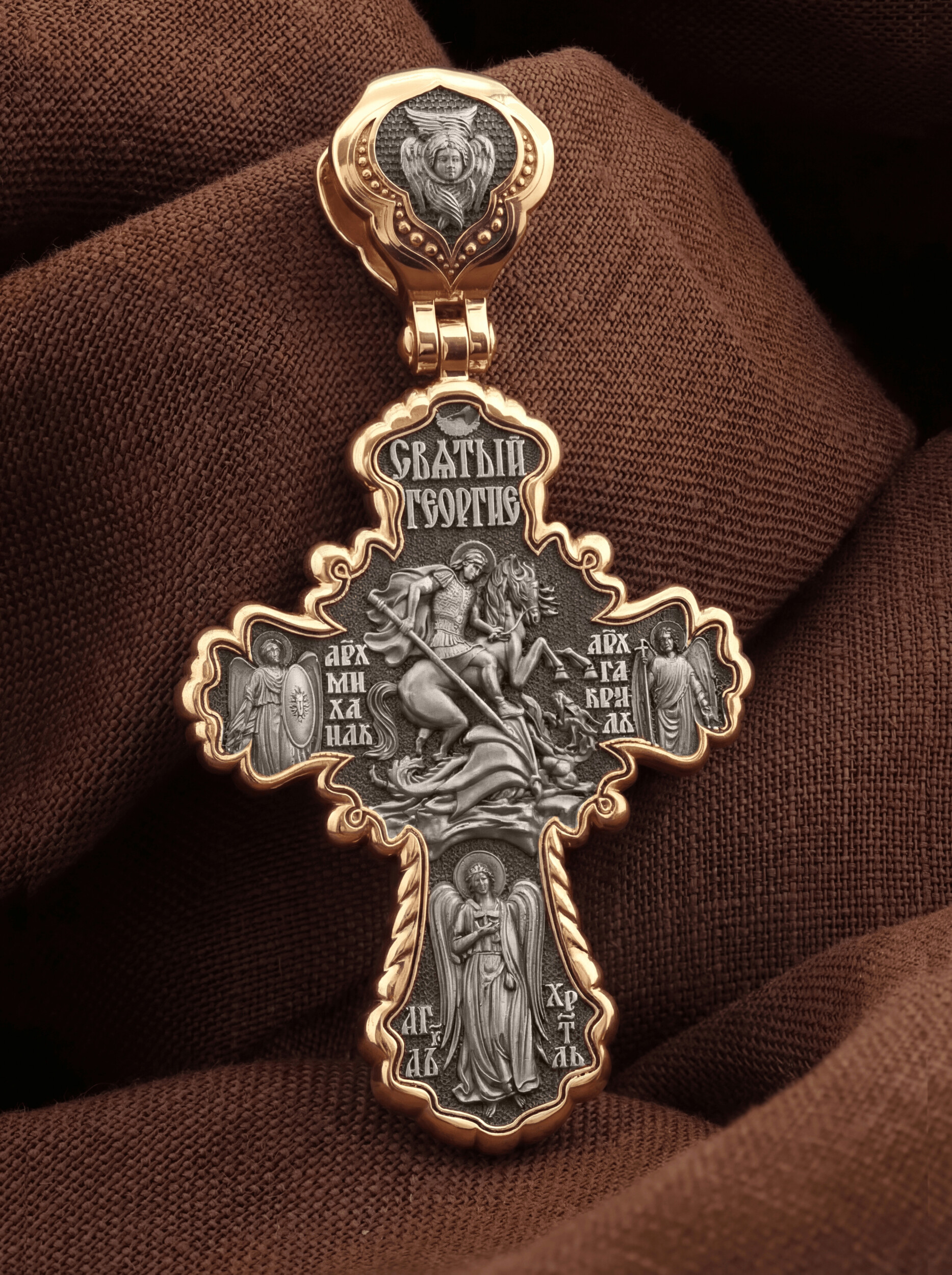 В центре оборотной стороны креста помещено изображение Святого Великомученика Георгия Победоносца. Он изображен как воитель, сидящий на вздыбленном коне и поражающий копьем огнедышащего змея. Змей символизирует собою сатанинские силы. Молитвами вознесенными к Всевышнему и своей непреклонной верой он смог одолеть чудовище. Святой убил змея, спас царскую дочь, принесенную в жертву, и жителей города, их души от влияния дьявола, породив в них надежду и веру в Господа, призывая людей принять христианскую веру. Слева от Святого Георгия изображен Архистратиг Михаил, справа — Архангел Гавриил. Ниже помещен образ Ангела Хранителя. На кулонном кольце изображен шестикрылый Ангел — Серафим.