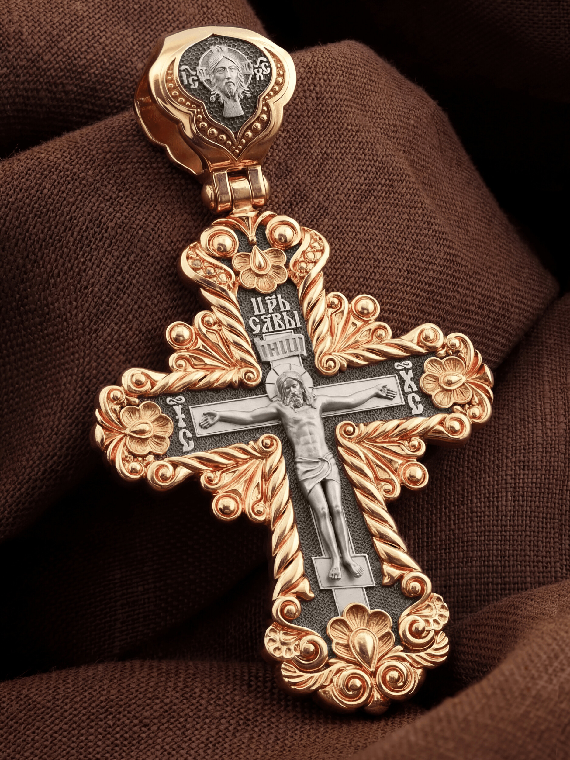 На лицевой стороне креста изображено Распятие Господа и Спасителя нашего Иисуса Христа, отдавшего Себя на смерть, для искупления грехов мира. Крест является символом жертвенной любви Всеблагого Бога к падшим людям, всепобеждающим духовным оружием христиан, основанием и средоточием церковной жизни. Господь сказал: кто хочет идти за Мною, отвергнись себя, и возьми крест свой, и следуй за Мною. (Мк. 8: 34). Над Распятием помещена надпись «Царь Славы». На верхней табличке, выше головы Иисуса, расположена надпись, составленная Понтием Пилатом — «IНЦI». Она означает «Иисус Назорей, Царь Иудейский». Надпись «IC» «ХC», означает Иисус Христос, помещается на разных сторонах поперечной перекладины креста. На кулонном кольце изображен Нерукотворный образ Господа и Спасителя нашего Иисуса Христа, чудесно отпечатавшийся на плате, которым Христос вытер свой лик.