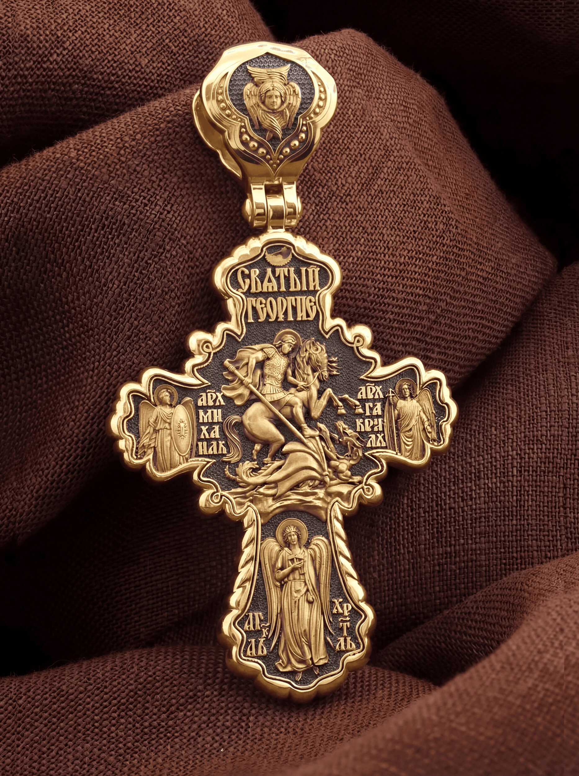 В центре оборотной стороны креста помещено изображение Святого Великомученика Георгия Победоносца. Он изображен как воитель, сидящий на вздыбленном коне и поражающий копьем огнедышащего змея. Змей символизирует собою сатанинские силы. Молитвами вознесенными к Всевышнему и своей непреклонной верой он смог одолеть чудовище. Святой убил змея, спас царскую дочь, принесенную в жертву, и жителей города, их души от влияния дьявола, породив в них надежду и веру в Господа, призывая людей принять христианскую веру. Слева от Святого Георгия изображен Архистратиг Михаил, справа — Архангел Гавриил. Ниже помещен образ Ангела Хранителя. На кулонном кольце изображен шестикрылый Ангел — Серафим.