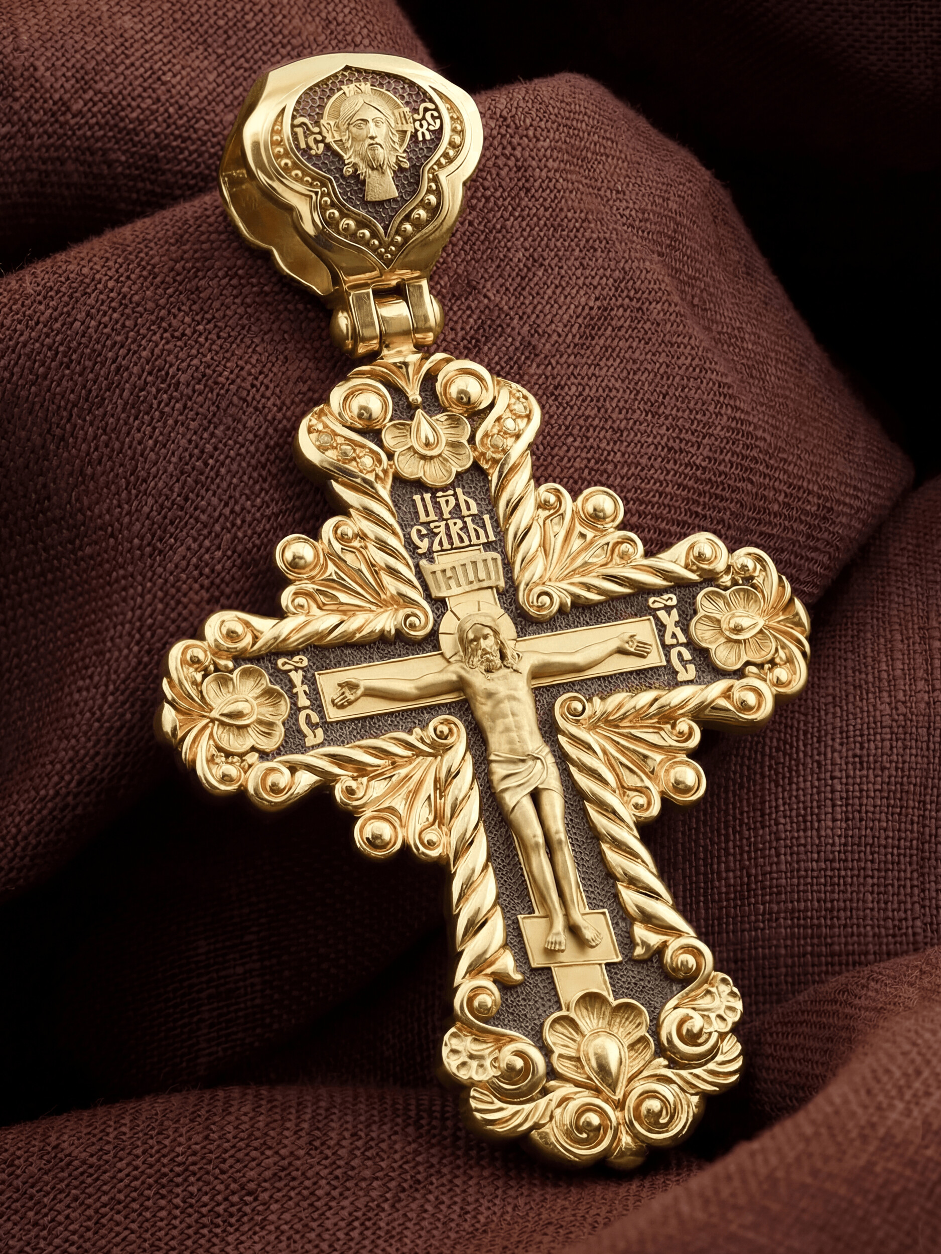 На лицевой стороне креста изображено Распятие Господа и Спасителя нашего Иисуса Христа, отдавшего Себя на смерть, для искупления грехов мира. Крест является символом жертвенной любви Всеблагого Бога к падшим людям, всепобеждающим духовным оружием христиан, основанием и средоточием церковной жизни. Господь сказал: кто хочет идти за Мною, отвергнись себя, и возьми крест свой, и следуй за Мною. (Мк. 8: 34). Над Распятием помещена надпись «Царь Славы». На верхней табличке, выше головы Иисуса, расположена надпись, составленная Понтием Пилатом — «IНЦI». Она означает «Иисус Назорей, Царь Иудейский». Надпись «IC» «ХC», означает Иисус Христос, помещается на разных сторонах поперечной перекладины креста. На кулонном кольце изображен Нерукотворный образ Господа и Спасителя нашего Иисуса Христа, чудесно отпечатавшийся на плате, которым Христос вытер свой лик.