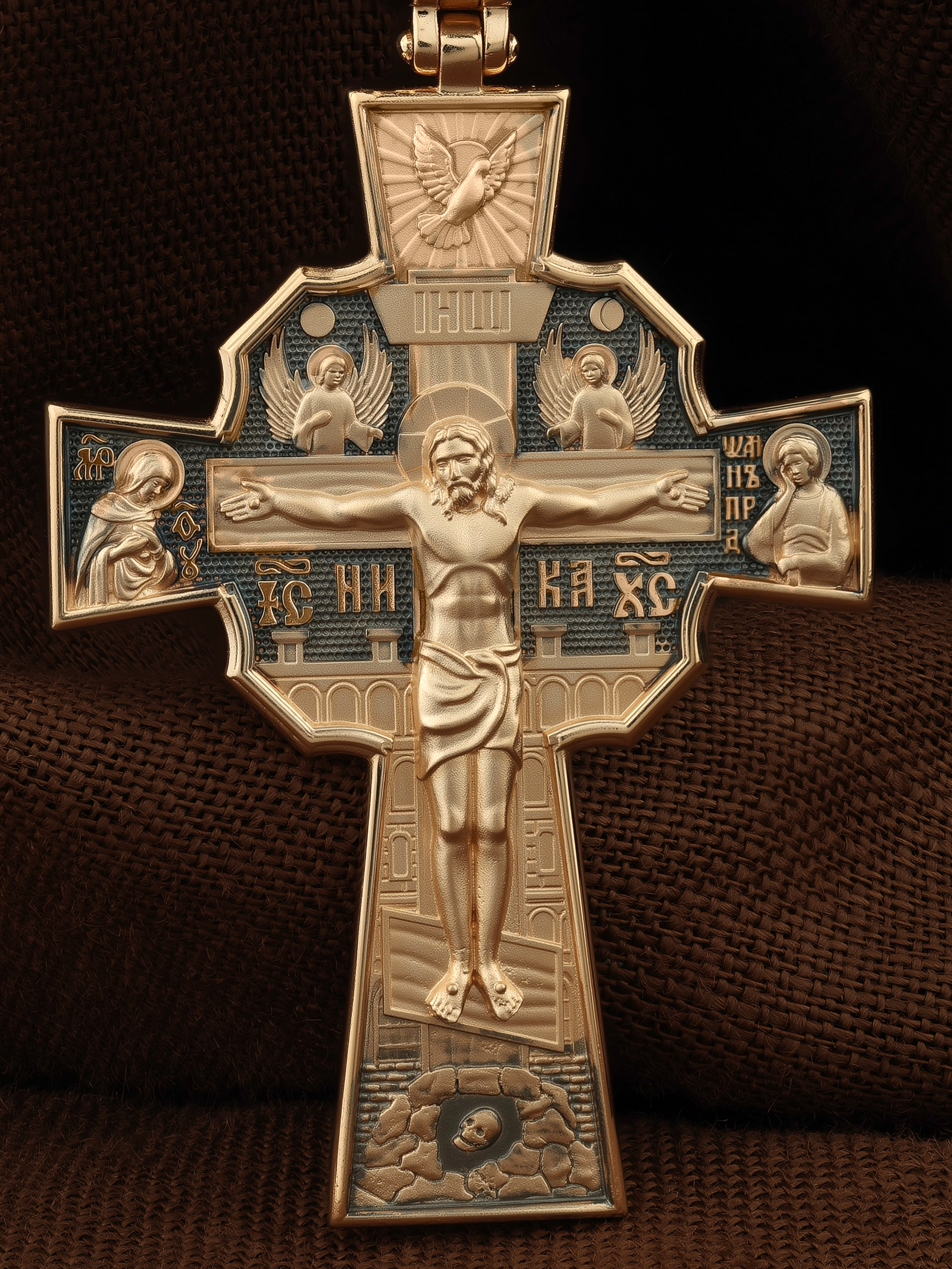 На лицевой стороне креста изображено Распятие Господа и Спасителя нашего Иисуса Христа, отдавшего Себя на смерть, для искупления грехов мира. Верхняя перекладина символизирует титло — табличку, на которой, согласно Евангелию, было начертано: Иисус Назорей Царь Иудейский (IНЦI). Распятие сопровождается надписями, олицетворяющими Христа. Надпись «IС» « ХС», что означает Иисус Христос, и слово «НИКА», что означает «победитель», помещаются ниже поперечной перекладины креста. Над вершиной Распятия помещено изображение Святого Духа, в виде голубя сходящего с небес, и двух Ангелов. Слева от Распятия изображена Пресвятая Богородица, справа — апостол и евангелист Иоанн Богослов, один из ближайших учеников Иисуса Христа. За крестом высится Иерусалимская стена, в знак того, что Господь был распят вне стен города. Возвышение, на котором стоит Крест, символизирует гору Голгофу, на которой произошло Распятие. Под подножием Креста изображена покоящаяся голова (череп) Адама. На кулонном кольце помещено изображение шестикрылого Серафим.