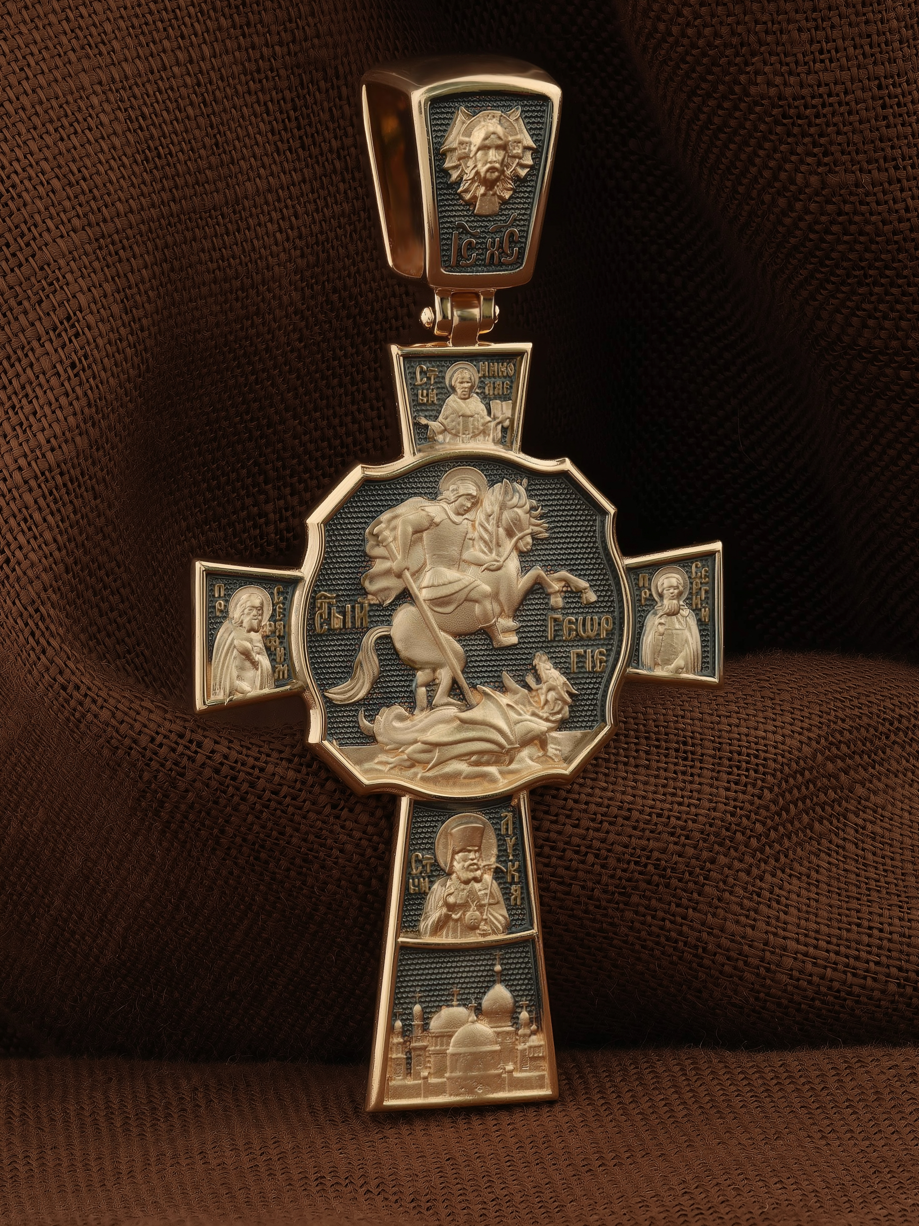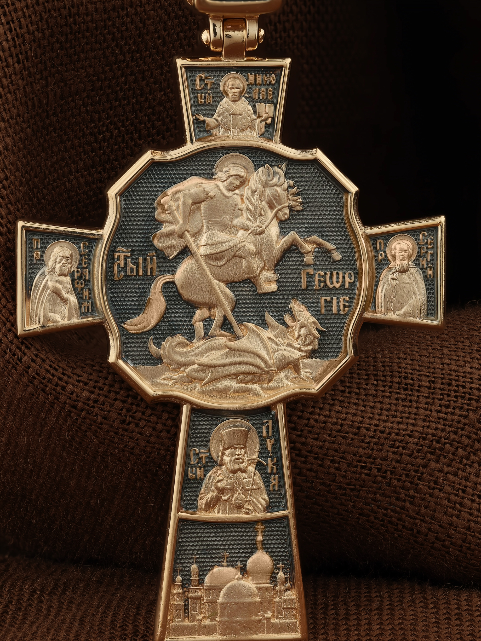 В центре оборотной стороне креста помещен образ Святого Великомученика Георгия Победоносца — одного из самых почитаемых и удивительных святых. На образке он изображен как воитель поражающий копьем огнедышащего змея. Змей символизирует собою сатанинские силы. Справа помещен образ Святого Преподобного Сергия, игумена Радонежского, чудотворца, слева — Преподобного Серафима Саровского, чудотвореца. Выше помещен образ Святителя Николая архиепископа Мир Ликийских, чудотвореца, ниже — образ святителя Луки (Войно-Ясенецкого), архиепископа Симферопольского и Крымского, исповедника и изображение Храма. На кулонном кольце изображен Спас Нерукотворный — образ Господа и Спасителя нашего Иисуса Христа, чудесно отпечатавшийся на плате, котором Христос вытер свой лик.