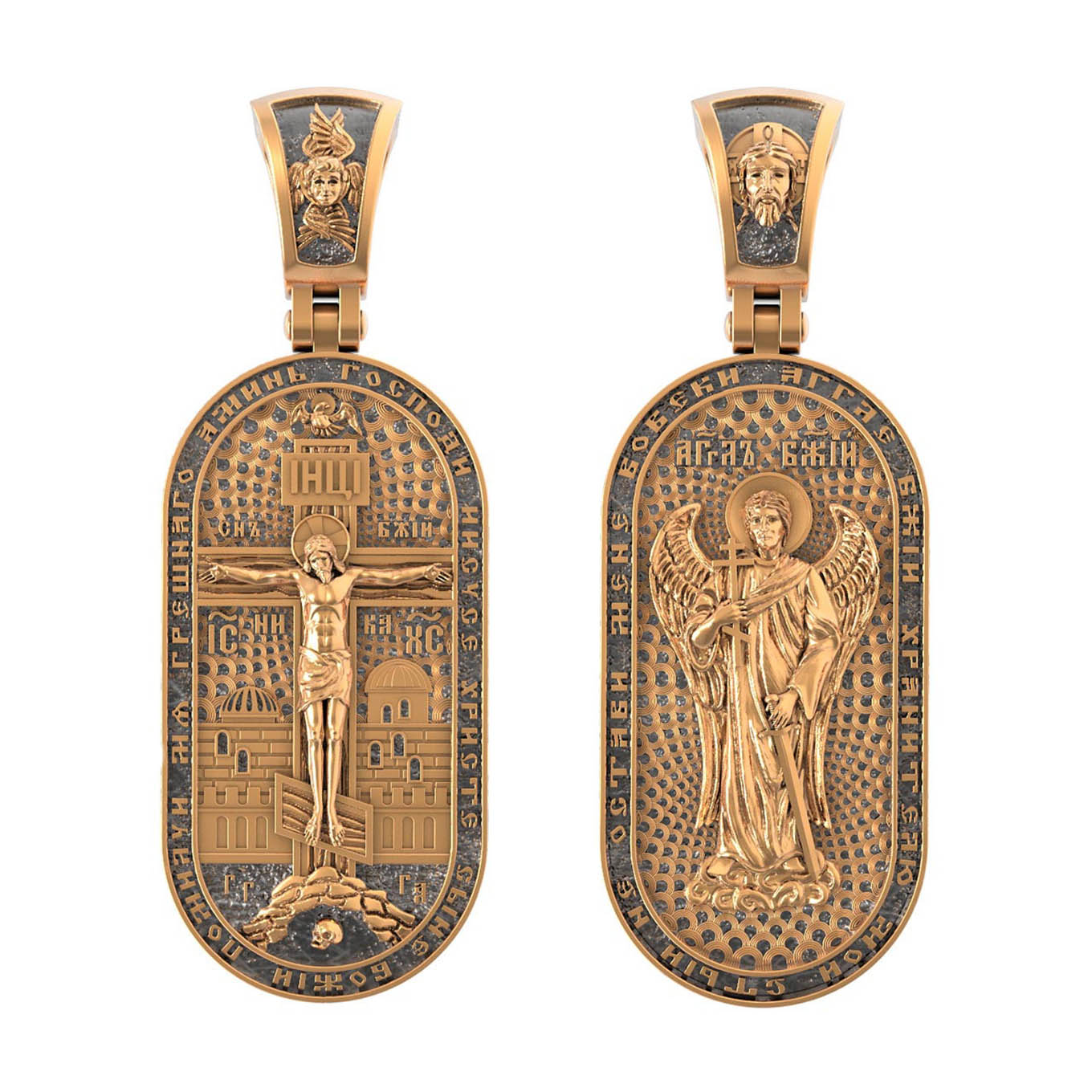 Центральную часть лицевой стороны занимает Распятие Христа — образ жертвы, принесенной Господом за грехи людей. Именно ко Христу, сошедшему на землю ради нашего спасения, возносятся все молитвы. Рядом с Его образом помещены слова — «НИКА» (греч. — Победитель) и «СЫН БОЖИЙ». Эти слова характеризуют Господа как Великого Архиерея, победителя смерти. Также Распятие сопровождается надписями, олицетворяющими Христа — это святое имя Христа «IC» (Иисус) «ХС» (Христос). Верхняя перекладина символизирует собой табличку с надписью «IHЦI» — Иисус Назарянин Царь Иудейский. Возвышение, на котором стоит Крест, символизирует гору Голгофу, на которой произошло Распятие. У подножия Креста изображают прах Адама, обозначенный черепом. На кулонном кольце изображен шестикрылый Серафим — самый приближенный к Господу Ангел. По контуру образка написана молитва: «Господи Иисусе Христе, Сыне Божий, помилуй мя грешного. Аминь»