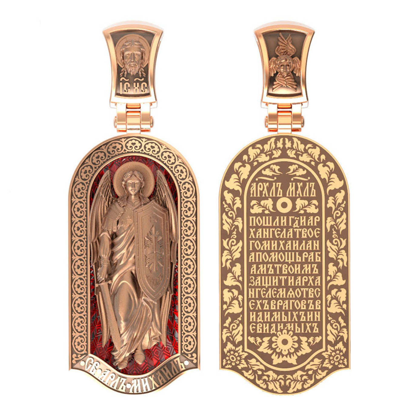 Основой композиции лицевой стороны является ростовое изображение Архангела Михаила — Архистратига всех Небесных Воинств. Он ведет непримиримую войну против сил зла, охраняет райские врата и защищает души людей. Его имя означает «Кто яко Бог?», так как он самый могучий и грозный враг зла. Он первым ополчился на Денницу, когда тот восстал против Бога, низверг его с Неба и не перестает сражаться с его темным воинством. Поэтому он часто изображается в виде воина, в доспехах и с огненным мечом. Но как служитель Небесного Царя и глава Ангелов и Архангелов на многих иконах он предстает в богатой одежде византийских придворных.