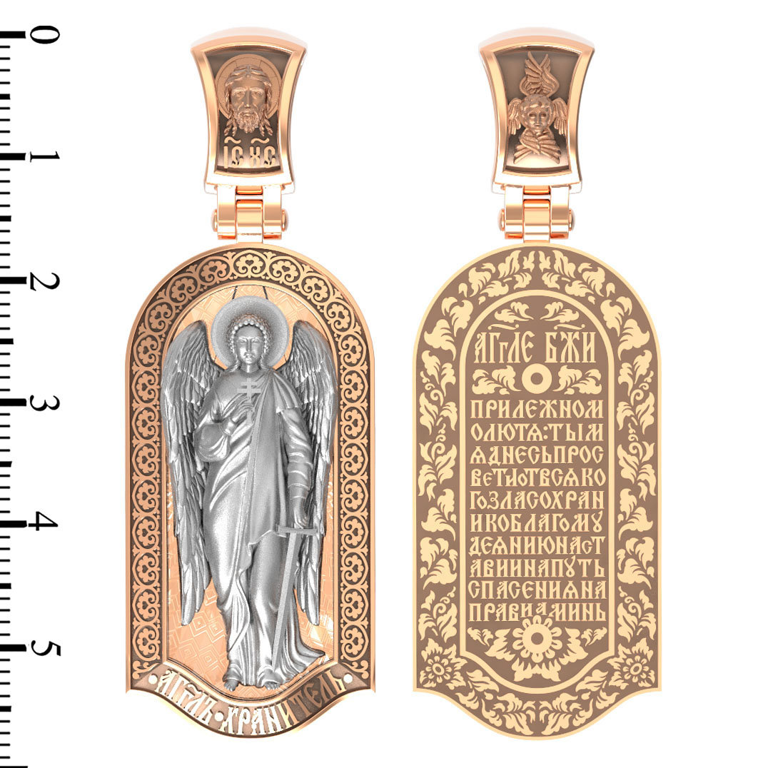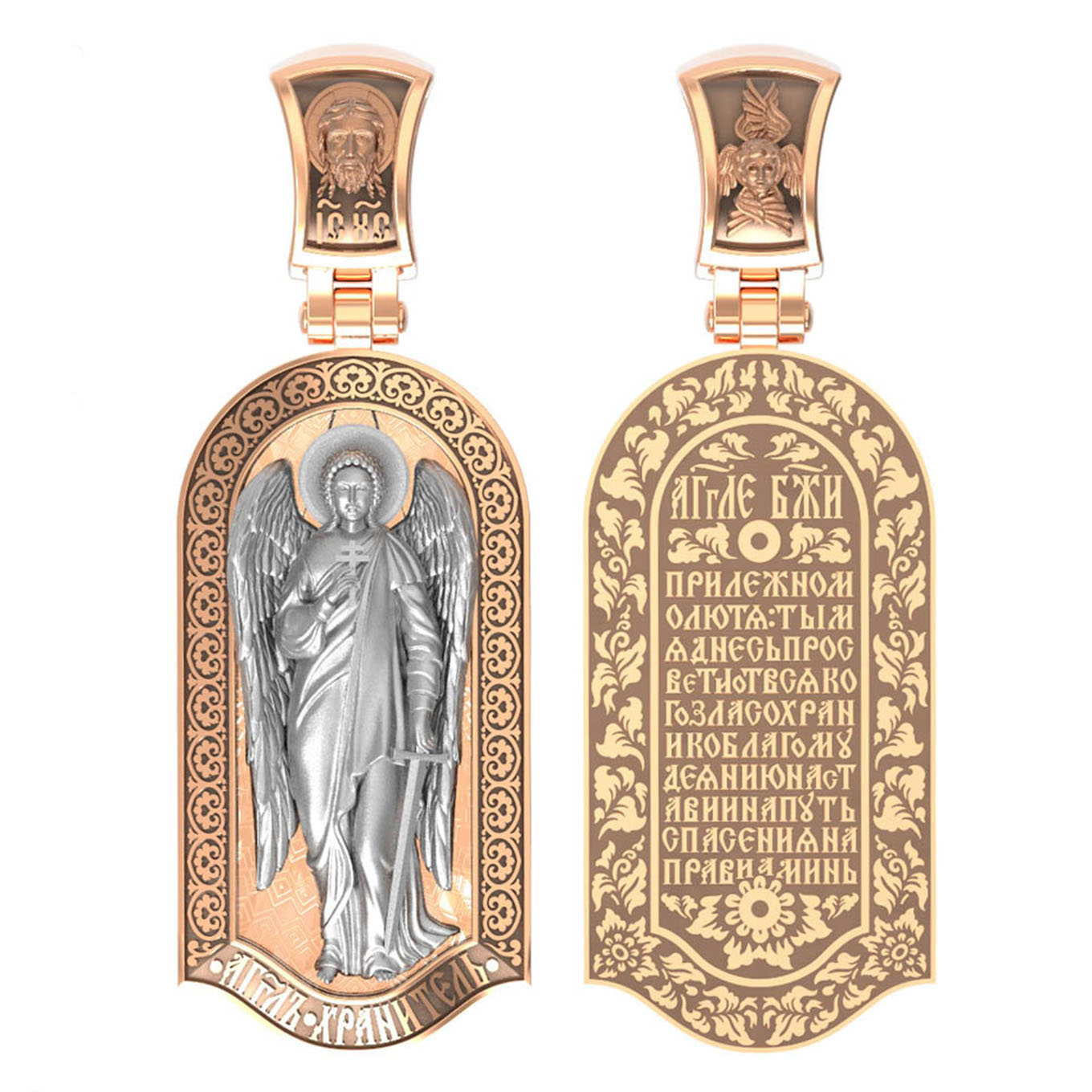 Основой композиции лицевой стороны является Ангела Хранителя. Образок Ангел Хранитель — это не просто украшение, а настоящая миниатюрная икона. В руках Ангел держит традиционные символические атрибуты Ангелов Хранителей: крест — знак послушания Христу и следования Его заповедям, меч — символ непримиримой борьбы, которую он ведет с бесами, отражая их нападения на людей. Слово «ангел» означает «вестник». Ангелы — верные служители Божьи, которых Господь посылает возвещать Свои повеления. Ангелы тварны, как и люди, но имеют другую природу. На иконах они изображаются в человеческом обличье с большими крыльями. Могучие крылья ангелов символизируют быстроту, с которой они исполняют повеления Бога, а небольшие ленточки у ушей –тороки, или слухи — показывают, что они всегда слышат Его голос.