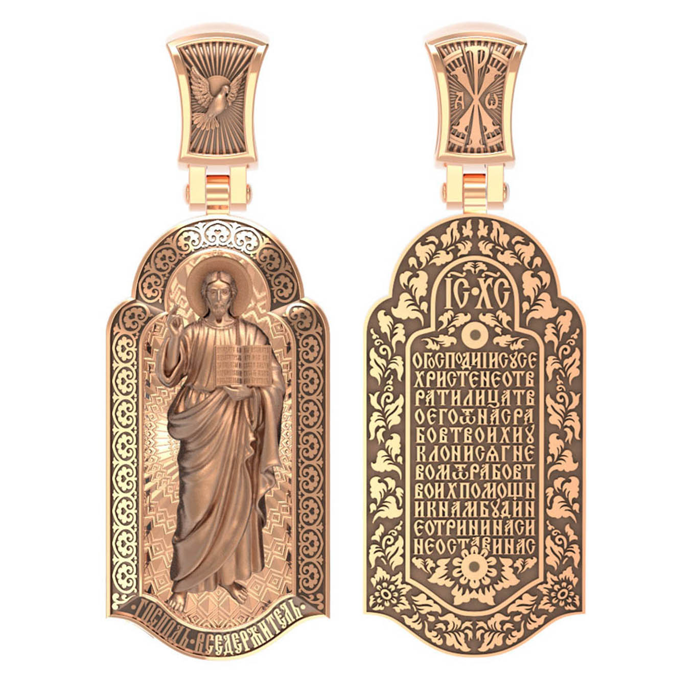 На лицевой стороне креста изображен Иисус Христос в образе Вседержителя, по-гречески «Пантократор». Это древнейший образ Спасителя, на котором Он представлен как властелин и правитель мира. Христос держит в руках Книгу, которая символизирует Книгу Бытия, то есть весь сотворенный Богом мир. В этой Книге судьбы всех людей, живущих на земле. Часто эту Книгу образно называют Книгой Жизни. Первое дошедшее до нас подобное изображение датируется VI веком и хранится в монастыре Святой Екатерины на горе Синай. Такие образы Христа с глубокой древности писались и в Палестине. Но Святая земля так часто подвергалась разграблению завоевателями, что древних икон там не осталось. Большинствоикон в храме Воскресения Христова были созданыв XIX веке.