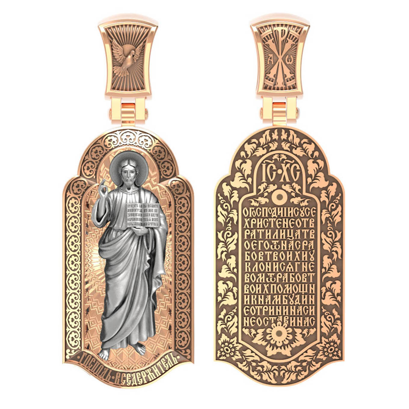 На лицевой стороне креста изображен Иисус Христос в образе Вседержителя, по-гречески «Пантократор». Это древнейший образ Спасителя, на котором Он представлен как властелин и правитель мира. Христос держит в руках Книгу, которая символизирует Книгу Бытия, то есть весь сотворенный Богом мир. В этой Книге судьбы всех людей, живущих на земле. Часто эту Книгу образно называют Книгой Жизни. Первое дошедшее до нас подобное изображение датируется VI веком и хранится в монастыре Святой Екатерины на горе Синай. Такие образы Христа с глубокой древности писались и в Палестине. Но Святая земля так часто подвергалась разграблению завоевателями, что древних икон там не осталось. Большинствоикон в храме Воскресения Христова были созданыв XIX веке.