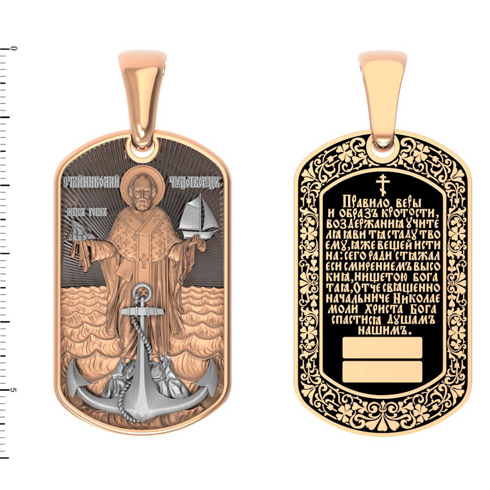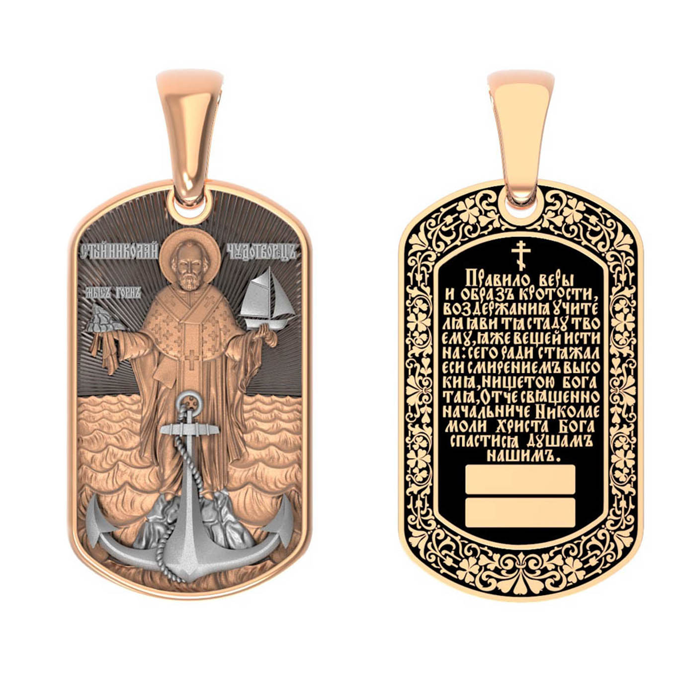 Лицевую сторону возглавляет икона Святителя Николая Чудотворца. Живший в III веке епископ Ликийского города Миры — самый почитаемый святой не только в России, но и во всем мире. Николай Чудотворец, помощник в делах, покровитель учащихся, утешитель обиженных и нуждающихся, целитель самых страшных и тяжелых недугов, предстатель и молитвенник за людей перед Богом. Также Святитель Николай Чудотворец известен своими молитвами за путешественников, когда непрестанный ветер и бушующие волны утихают и корабль заходит в спокойную гавань.