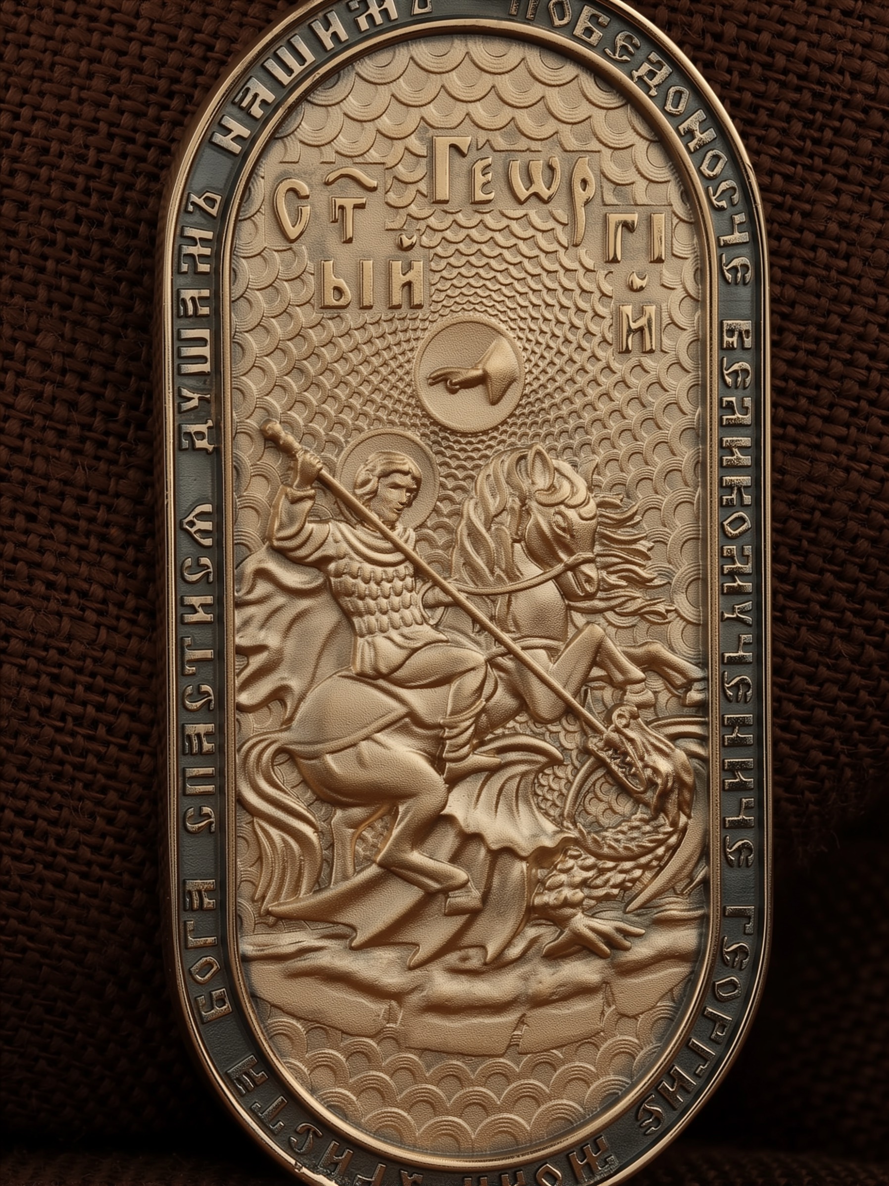 По контуру написана молитва: «Победоносче Великомучениче Георгие, моли Христа Бога спастися душам нашим». На кулонном кольце изображен Спас Нерукотворный — Символ вочеловечившегося Божества.
