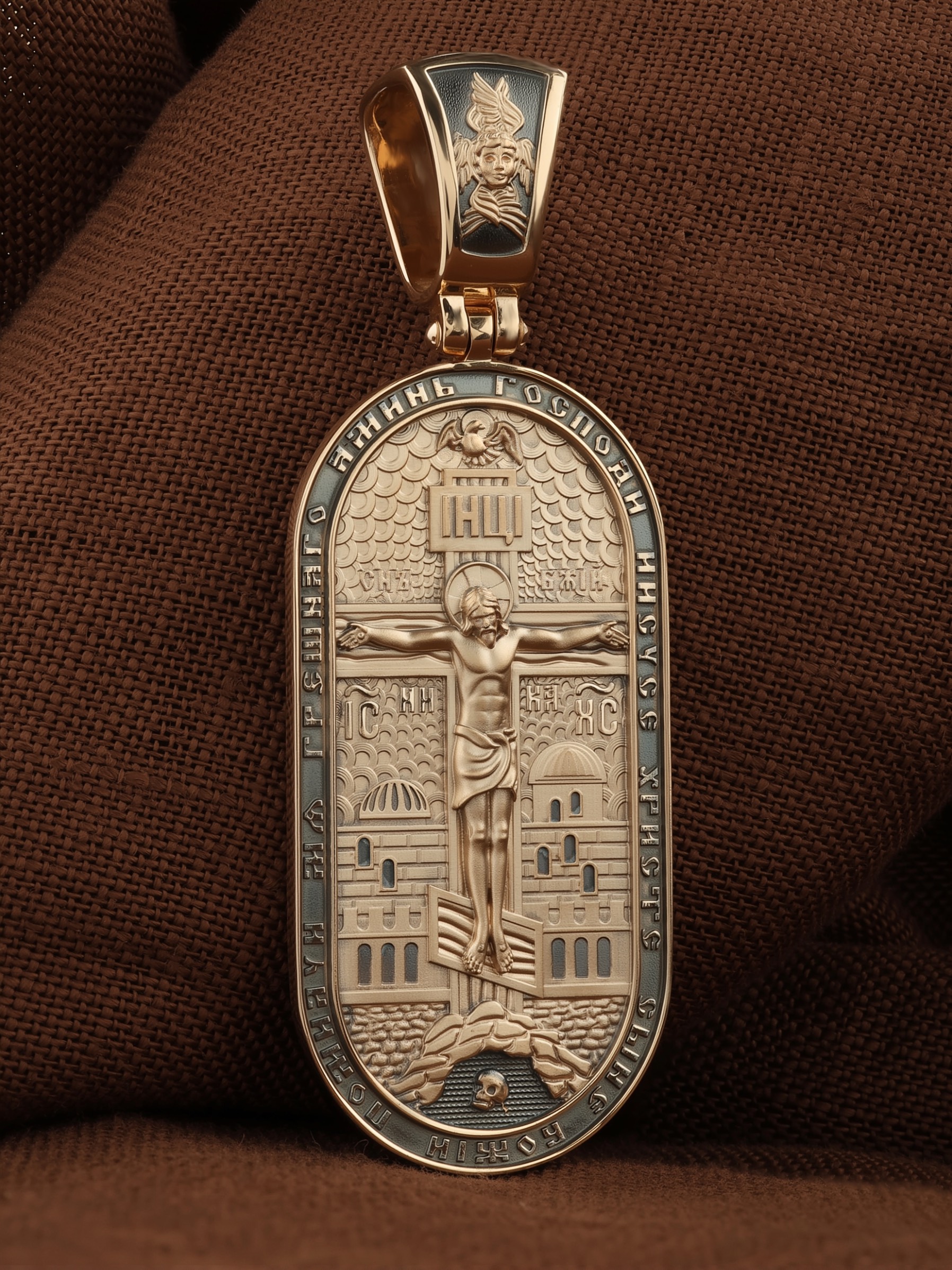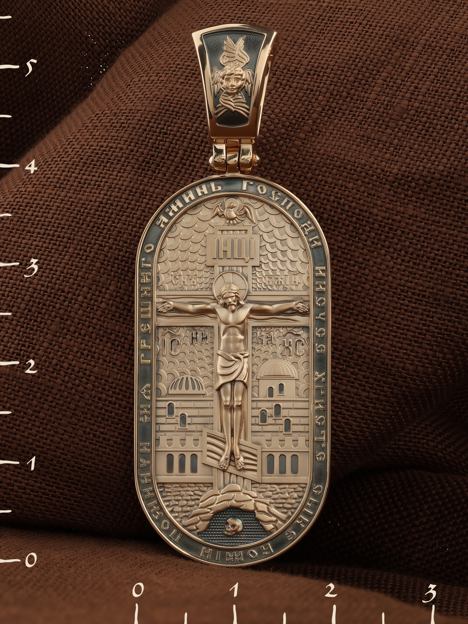 По контуру образка написана молитва: «Господи Иисусе Христе, Сыне Божий, помилуй мя грешного. Аминь». На кулонном кольце изображен шестикрылый Серафим — самый приближенный к Господу Ангел