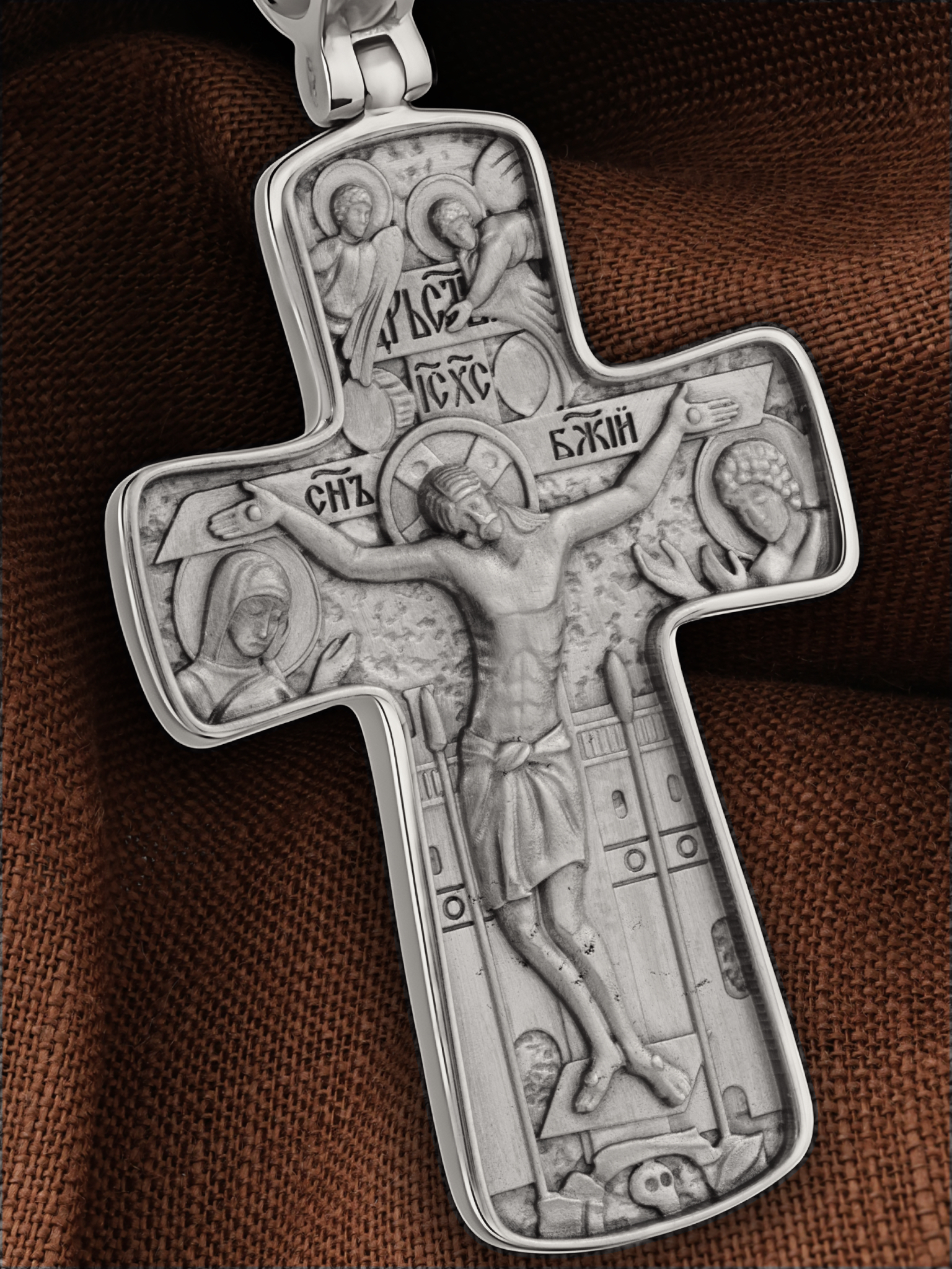 На лицевой стороне креста изображено Распятие Господа и Спасителя нашего Иисуса Христа. Крест- символ спасения и искупления рода человеческого, знамение победы над смертью и адом. Иисус Христос, как искупительная жертва освобождения человечества от власти греха, умер крестной смертью и в третий день воскрес. Господь сказал: кто хочет идти за Мною, отвергнись себя, и возьми крест свой, и следуй за Мною. (Мк. 8: 34). Над вершиной Распятия помещена надпись «Царь Славы». На верхней табличке, выше головы Иисуса, расположена надпись, составленная Понтием Пилатом — «IНЦI». Надпись «IС» « ХС» означает Иисус Христос и помещается на разных сторонах поперечной перекладины креста. Рядом расположена надпись «Сын Божий». Над Распятием изображены ангелы. Слева от Распятия изображена Пресвятая Богородица, справа — апостол и евангелист Иоанн Богослов, один из ближайших учеников Иисуса Христа. Крест стоит на горе камней, символизирующих Голгофу. В ее основании различается череп — это голова Адама. Вдоль креста изображены копие сотника Лонгина и трость с губкой.