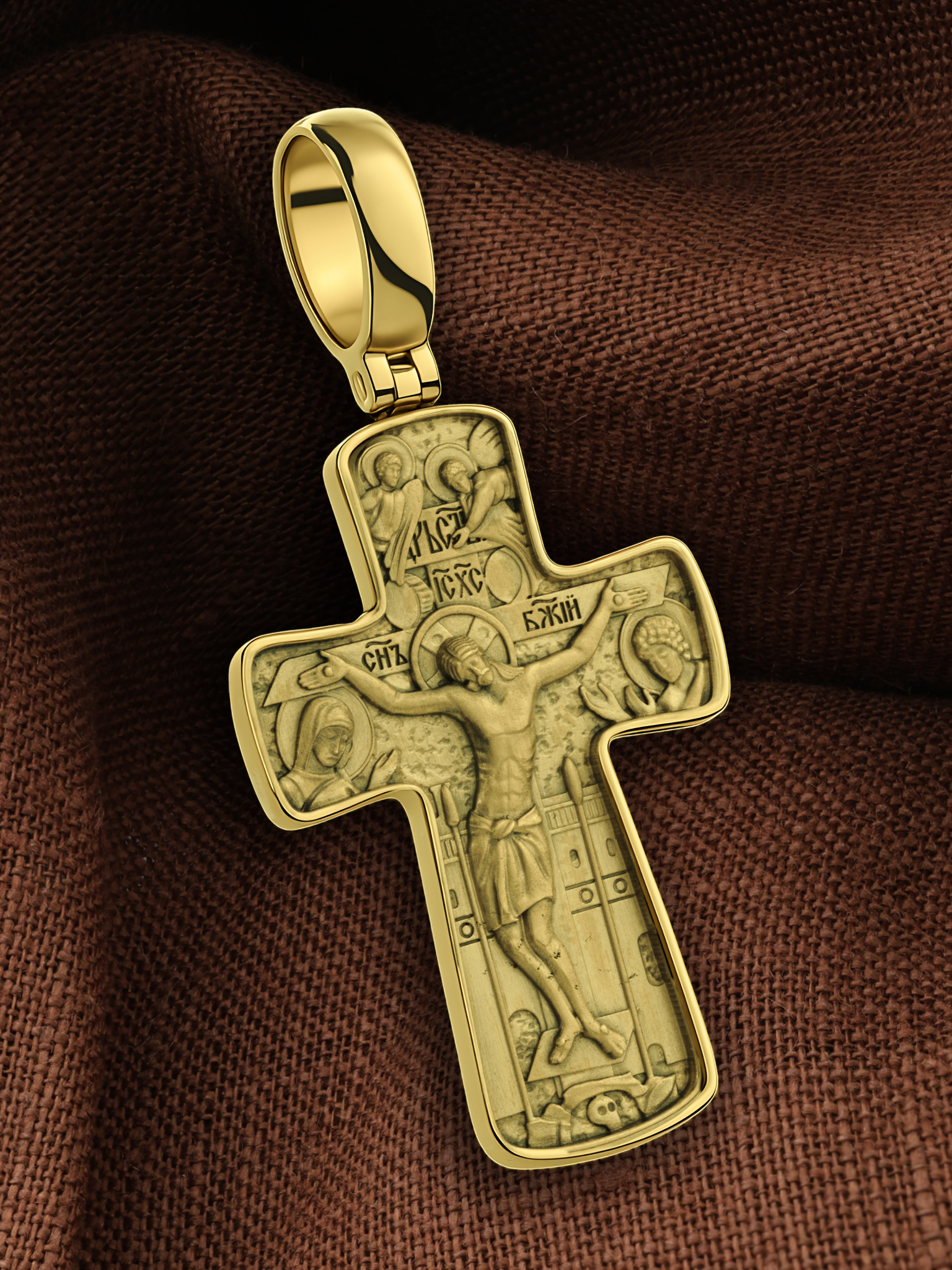 На лицевой стороне креста изображено Распятие Господа и Спасителя нашего Иисуса Христа. Крест- символ спасения и искупления рода человеческого, знамение победы над смертью и адом. Иисус Христос, как искупительная жертва освобождения человечества от власти греха, умер крестной смертью и в третий день воскрес. Господь сказал: кто хочет идти за Мною, отвергнись себя, и возьми крест свой, и следуй за Мною. (Мк. 8: 34). Над вершиной Распятия помещена надпись «Царь Славы». На верхней табличке, выше головы Иисуса, расположена надпись, составленная Понтием Пилатом — «IНЦI». Надпись «IС» « ХС» означает Иисус Христос и помещается на разных сторонах поперечной перекладины креста. Рядом расположена надпись «Сын Божий». Над Распятием изображены ангелы. Слева от Распятия изображена Пресвятая Богородица, справа — апостол и евангелист Иоанн Богослов, один из ближайших учеников Иисуса Христа. Крест стоит на горе камней, символизирующих Голгофу. В ее основании различается череп — это голова Адама. Вдоль креста изображены копие сотника Лонгина и трость с губкой.