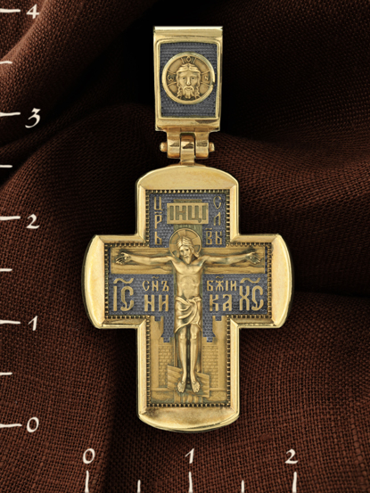 На лицевой стороне креста изображено Распятие Господа и Спасителя нашего Иисуса Христа, отдавшего Себя на смерть, для искупления грехов мира. Крест является символом жертвенной любви Всеблагого Бога к падшим людям, всепобеждающим духовным оружием христиан, основанием и средоточием церковной жизни. Над вершиной Распятия помещена надпись «Царь Славы». На верхней табличке, выше головы Иисуса, расположена надпись, составленная Понтием Пилатом — «IНЦI». Она означает «Иисус Назорей, Царь Иудейский». Распятие сопровождается каноническими надписями. Надпись «IC» «ХC», означает Иисус Христос, надпись «НИКА» (греч. Победитель) и словосочетание «СЫН БОЖИЙ», что означает божественную природу Иисуса Христа, помещаются на разных сторонах поперечной перекладины креста. Сзади — Иерусалимская стена. На кулонном кольце изображен Спас Нерукотворный — образ Господа и Спасителя нашего Иисуса Христа, чудесно отпечатавшийся на плате, котором Христос вытер свой лик.