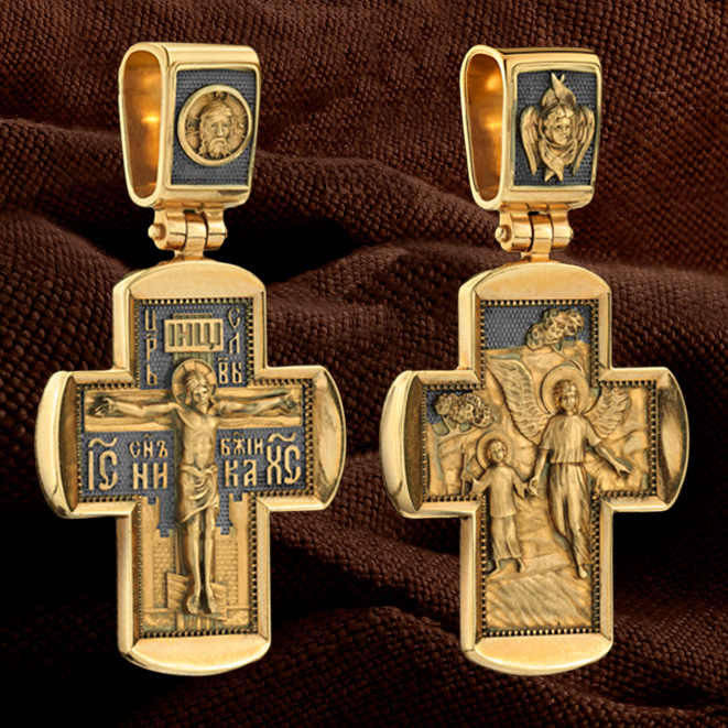 На оборотной стороне креста изображен святой Ангел-Хранитель, ведущий человеческую душу, которая представлена в виде ребёнка. Ангел-Хранитель — это Ангел приставляемый Богом к человеку при крещении для охраны и помощи в добрых делах. Он невидимо находится при человеке на протяжении всей его жизни, если человек сохраняет в себе любовь к Богу и истинную веру перед Ним. Ангел-Xранитель делают для нас все, что служит к истинному нашему благу и спасению. Невидимо пребывая при нас постоянно, он, руководствуя нас ко спасению, не только по нашему желанию таинственно наставляет нас на все доброе и полезное, не только возносит наши молитвы к Богу, но еще и сам от себя охраняют и защищают нас от врагов видимых и невидимых и ходатайствует за нас пред Богом. Одного лишь каждому из нас он желает — спасения души; к этому он направляет все свои заботы. И если видит нас также заботящимися о спасении, радуется, если же видит нас пребывающими в нерадении о душе своей, скорбит. Но и самый великий грешник может примириться со своим Ангелом-Хранителем посредством искреннего раскаяния в грехах и оставления их навсегда. В таком случае, по слову Писания, великая радость бывает для всех ангелов на небесах (Лк. 15:10). На кулонном кольце изображен Серафим.