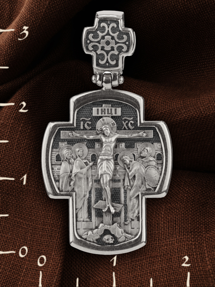 На лицевой стороне креста изображено Распятие Господа и Спасителя нашего Иисуса Христа. Своими крестными страданиями Господь смыл наши грехи, покрыл наш долг перед Богом или, на языке Писания, нас «искупил». В Голгофе сокрыта непостижимая тайна бесконечной правды и любви Бога. Крест стал символом победы добра над злом, жизни над смертью, напоминанием бесконечной Божьей любви, предметом радости. Воплотившийся Сын Божий Своею кровью освятил крест и сделал его проводником Своей благодати, источником освящения верующих. На верхней табличке, выше головы Иисуса, расположена надпись, составленная Понтием Пилатом — «IНЦI». Она означает «Иисус Назорей, Царь Иудейский». Ниже перекладины написано сокращенно имя Спасителя «IC» «XC» — Иисус Христос. Крест стоит на горе камней, символизирующих Голгофу. Под подножием Креста изображена покоящаяся голова (череп) Адама. Слева от Распятия стоят оплакивающие Господа Пресвятая Богородица и святая мироносица Мария Клеопова. Справа — апостол и евангелист Иоанн Богослов, один из ближайших учеников Иисуса Христа и сотник Лонгин. По преданию, увидя, что они горько плачут, Иисус сказал Матери Своей: «Жено! Се сын Твой!» Потом сказал ученику Иоанну: «Се мати твоя». С этого времени Иоанн взял Матерь Божию к себе, и Она жила в его доме до самой смерти.