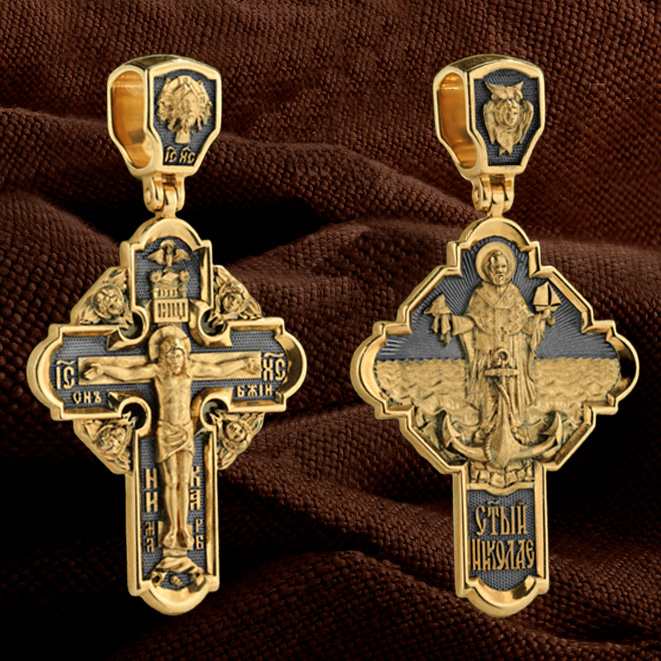 На лицевой стороне креста изображено Распятие Господа и Спасителя нашего Иисуса Христа, отдавшего Себя на смерть, чтобы другие могли жить — жить вечной жизнью, жить с Богом. Своею кровью Господь освятил крест и сделал его проводником Своей благодати, источником освящения верующих. На верхней табличке, выше головы Иисуса, расположена надпись, составленная Понтием Пилатом — «ИНЦИ». Она означает «Иисус Назорей, Царь Иудейский». Надпись «IС ХС» означает Иисус Христос помещается на разных сторонах поперечной (большой) перекладины креста. На кулонном кольце помещено изображение Духа Святого в виде голубя, сходящего с Небес