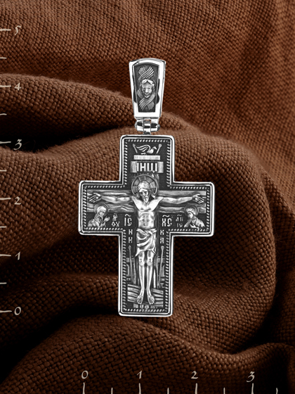 На лицевой стороне изображено Распятие Господа Иисуса Христа. С двух сторон Христу предстоят Пресвятая Богородица и св. пророк и Предтеча Господень Иоанн Креститель, которые имеют особое дерзновение перед Богом молиться за всех людей. Иконы, где они изображены молящимися Христу, называются Деисус, что значит «моление».