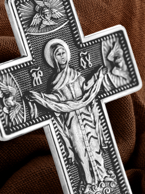 На обороте креста, в окружении крылатых Серафимов, изображена икона Покрова Пресвятой Богородицы. Праздник Покрова Божией Матери является воспоминанием чуда, которое произошло во Влахнернской церкви 1 (14) октября 910 года: Пресвятая Богородица явилась верующим над алтарем храма и распростерла над ними Свое покрывало. В этот день Божья Матерь открыла людям, что Она является Ходатаицей за них перед Богом. Богородица простирает Свой молитвенный покров над всеми православными христианами и умоляет Сына Своего о даровании вечного спасения каждому человеку.