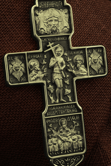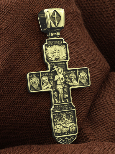 На концах горизонтальной балки креста помещены образы вселенских святителей и творцов литургии Василия Великого и Иоанна Златоуста. В кулонном кольце изображены райские врата с их стражем — Херувимом. Врата, которые открылись благодаря крестной жертве Христа.