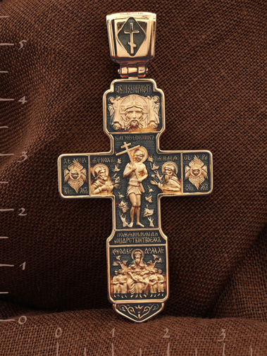 В нижней части креста изображены образы первых русских святых князей-мучеников — Бориса (князь ростовский) и Глеба (князь муромский) и святого равноапостольного князя Владимира. Страстотерпцам Борису и Глебу молятся об умиротворении Отечества, о добром нраве властей и правителей, о сохранении от междоусобицы, о даровании мужества перед лицом смертельной опасности. С Борисом и Глебом неразрывно связан образ их отца — святого равноапостольного князя Владимира, который также почитается как защитник и покровитель Русской Земли и Церкви. В молитвах его называют «отец русский» или «отец всея Руси».