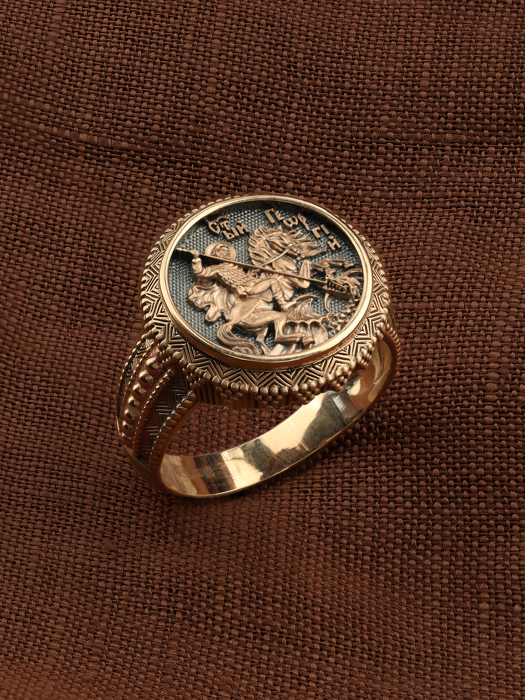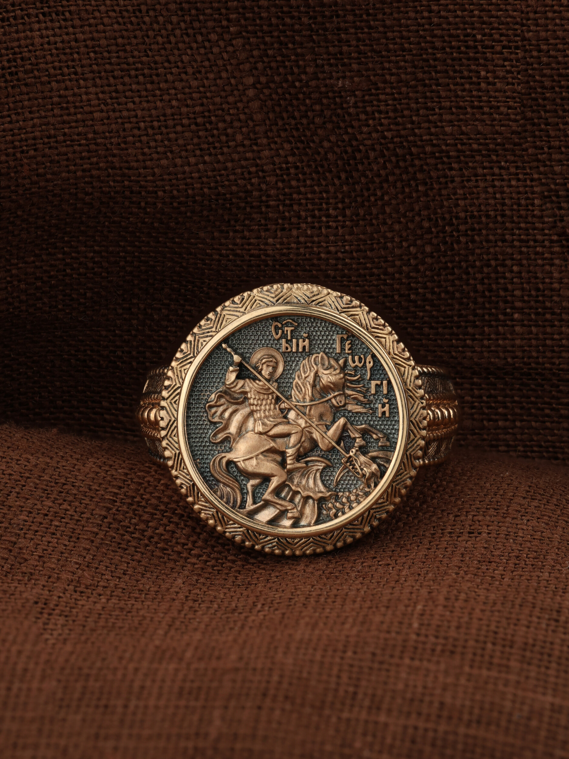 Кольцо «Святой Великомученик Георгий Победоносц» выполнено в древних христианских традициях. Основой композиции является изображение Святого Великомученика Георгия Победоносца — одного из самых почитаемых и удивительных святых. Георгий родился в Каппадокии (Малая Азия) в семье богатых и знатных горожан. Юношей поступил на службу к римскому императору Диоклетиану, за отличное знание военного дела и проявленную в боях и походах храбрость был приближен к императору и удостоен высокого воинского звания. Во время начавшихся гонений на христиан, перешел на сторону гонимых и, отвергнув человеческий страх, стал ярым проповедником учения Христа. Мучители подвергли опального воеводу жесточайшим восьмидневным пыткам и казнили его (обезглавили) в возрасте около тридцати лет в 303 году. На Руси он известен как Юрий или Егорий, заступник для верующих, чья жизнь имеет какое-либо отношение к военным делам, помощник в крестьянском труде. Георгий изображен как воитель, сидящий на вздыбленном коне и поражающий копьем огнедышащего змея. Справа над образом изображена благословляющая Божия десница. Змей символизирует собою сатанинские силы. Молитвами вознесенными к Всевышнему и своей непреклонной верой он смог одолеть чудовище. Святой убил змея, спас царскую дочь, принесенную в жертву, и жителей города, их души от влияния дьявола, породив в них надежду и веру в Господа, призывая людей принять христианскую веру.