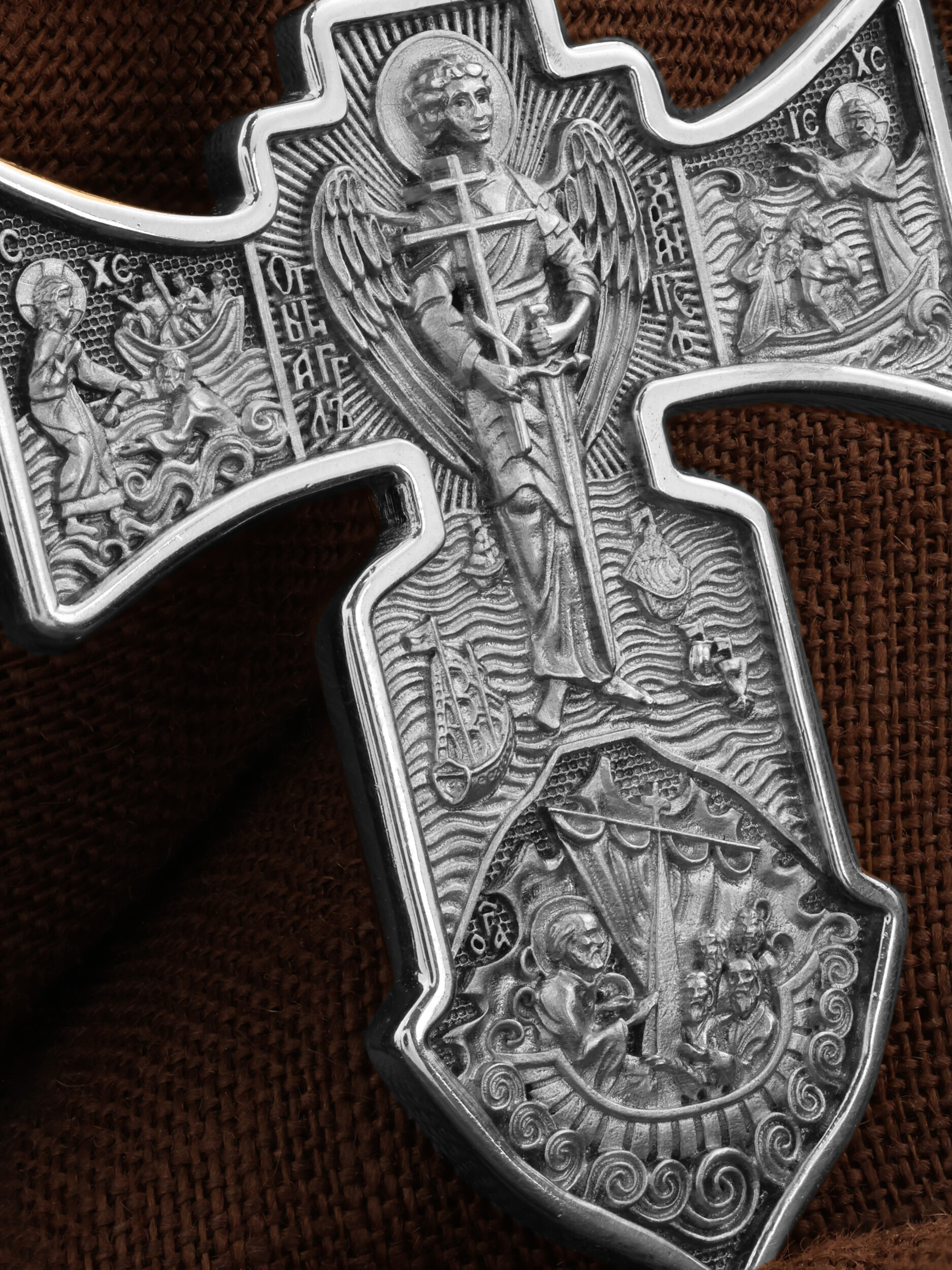 Оборот Морского креста весь посвящен охранению и спасению путешествующих по морю. В центре — могучая фигура Ангела Хранителя с крестом и мечом. Он стоит на волнах. Это образ Ангела Хранителя, стража душ человеческих как на море, так и в буре житейских страстей и искушений.