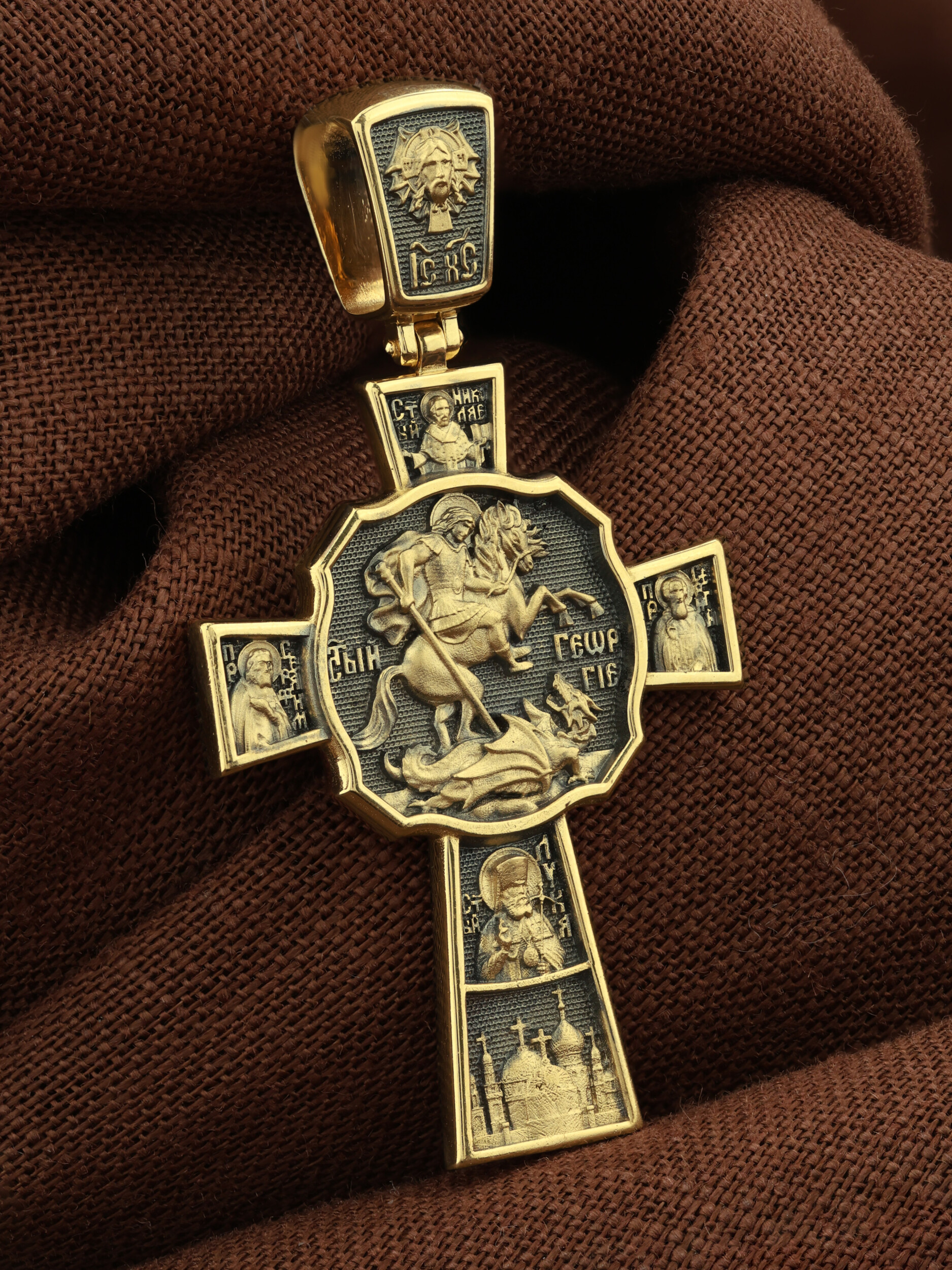 В центре оборотной стороне креста помещен образ Святого Великомученика Георгия Победоносца — одного из самых почитаемых и удивительных святых. На образке он изображен как воитель поражающий копьем огнедышащего змея. Змей символизирует собою сатанинские силы. Справа помещен образ Святого Преподобного Сергия, игумена Радонежского, чудотворца, слева — Преподобного Серафима Саровского, чудотвореца. Выше помещен образ Святителя Николая архиепископа Мир Ликийских, чудотвореца, ниже — образ святителя Луки (Войно-Ясенецкого), архиепископа Симферопольского и Крымского, исповедника и изображение Храма. На кулонном кольце изображен Спас Нерукотворный — образ Господа и Спасителя нашего Иисуса Христа, чудесно отпечатавшийся на плате, котором Христос вытер свой лик.