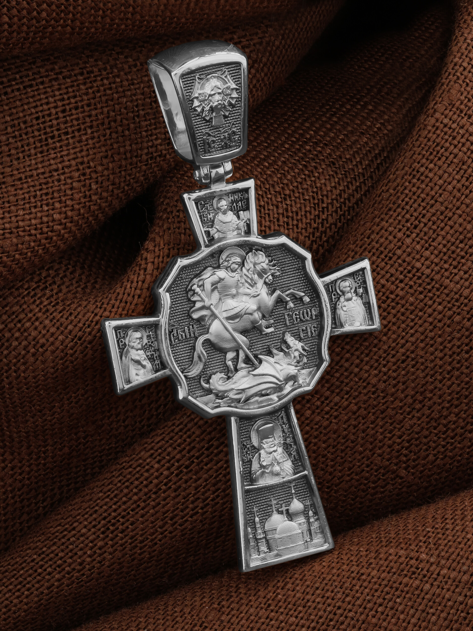 В центре оборотной стороне креста помещен образ Святого Великомученика Георгия Победоносца — одного из самых почитаемых и удивительных святых. На образке он изображен как воитель поражающий копьем огнедышащего змея. Змей символизирует собою сатанинские силы. Справа помещен образ Святого Преподобного Сергия, игумена Радонежского, чудотворца, слева — Преподобного Серафима Саровского, чудотвореца. Выше помещен образ Святителя Николая архиепископа Мир Ликийских, чудотвореца, ниже — образ святителя Луки (Войно-Ясенецкого), архиепископа Симферопольского и Крымского, исповедника и изображение Храма. На кулонном кольце изображен Спас Нерукотворный — образ Господа и Спасителя нашего Иисуса Христа, чудесно отпечатавшийся на плате, котором Христос вытер свой лик.