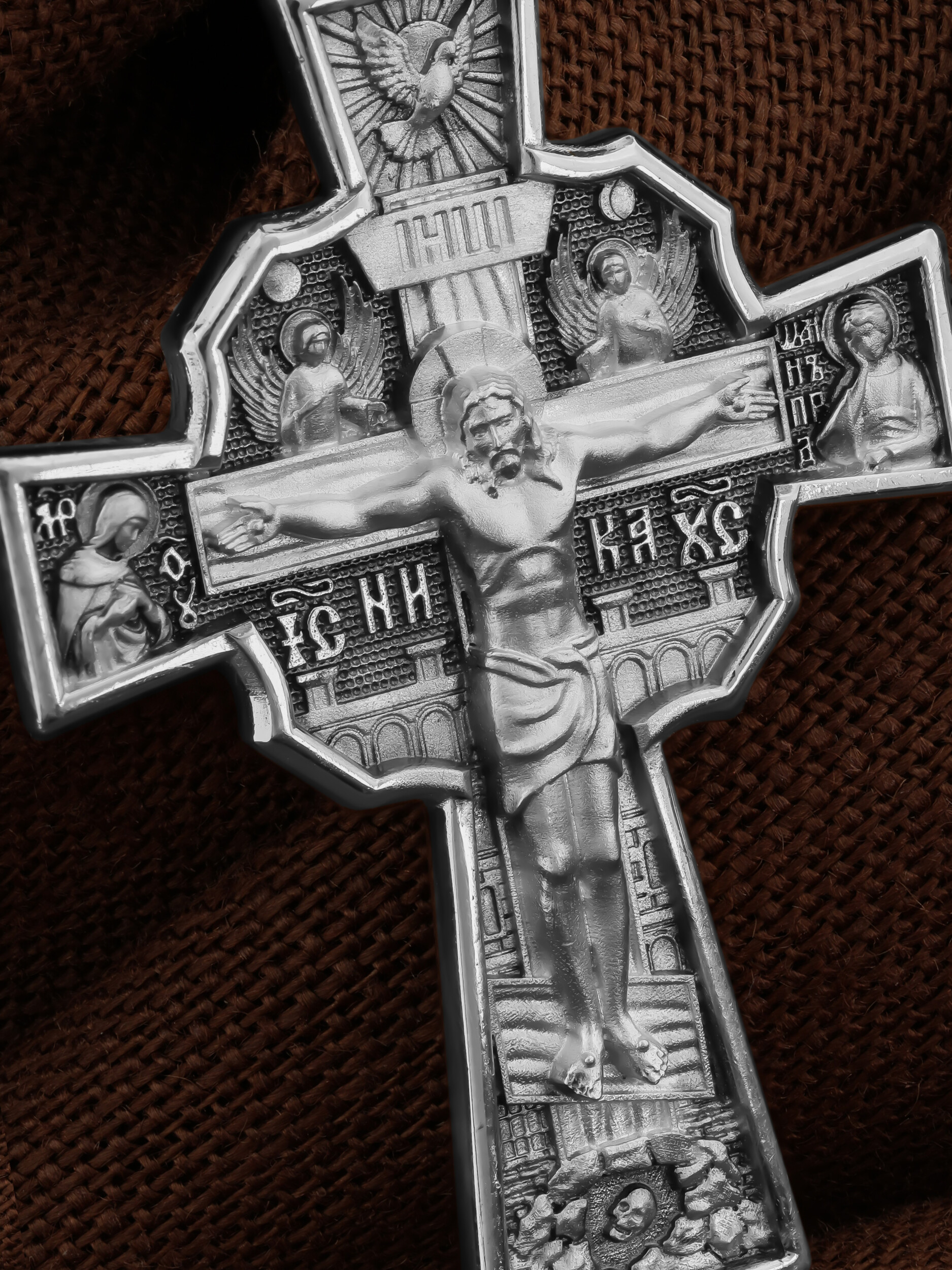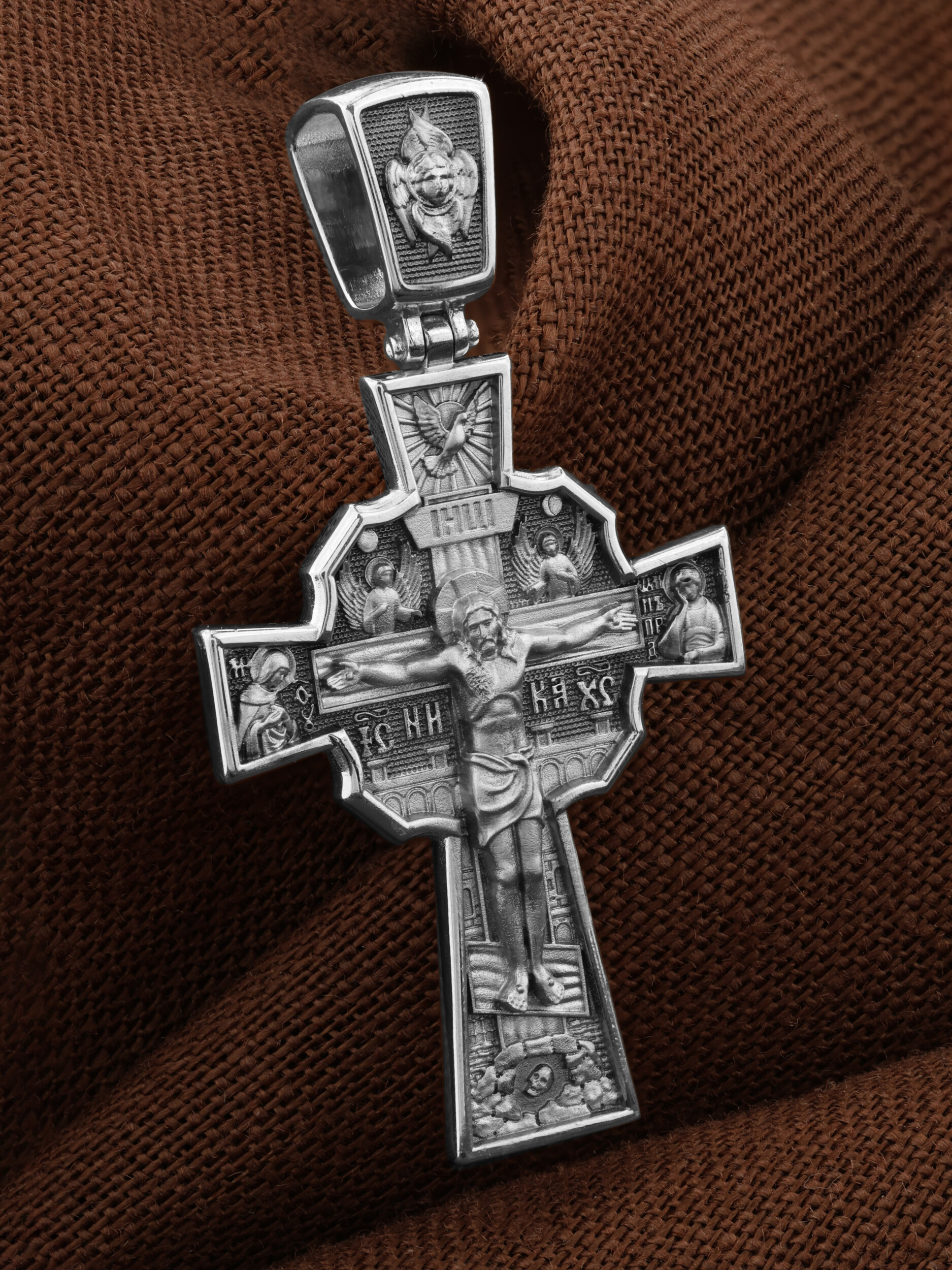 На лицевой стороне креста изображено Распятие Господа и Спасителя нашего Иисуса Христа, отдавшего Себя на смерть, для искупления грехов мира. Верхняя перекладина символизирует титло — табличку, на которой, согласно Евангелию, было начертано: Иисус Назорей Царь Иудейский (IНЦI). Распятие сопровождается надписями, олицетворяющими Христа. Надпись «IС» « ХС», что означает Иисус Христос, и слово «НИКА», что означает «победитель», помещаются ниже поперечной перекладины креста. Над вершиной Распятия помещено изображение Святого Духа, в виде голубя сходящего с небес, и двух Ангелов. Слева от Распятия изображена Пресвятая Богородица, справа — апостол и евангелист Иоанн Богослов, один из ближайших учеников Иисуса Христа. За крестом высится Иерусалимская стена, в знак того, что Господь был распят вне стен города. Возвышение, на котором стоит Крест, символизирует гору Голгофу, на которой произошло Распятие. Под подножием Креста изображена покоящаяся голова (череп) Адама. На кулонном кольце помещено изображение шестикрылого Серафим.