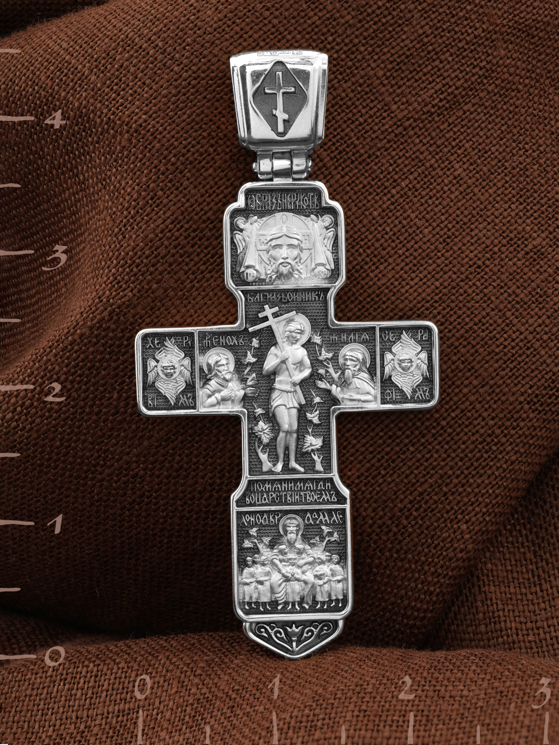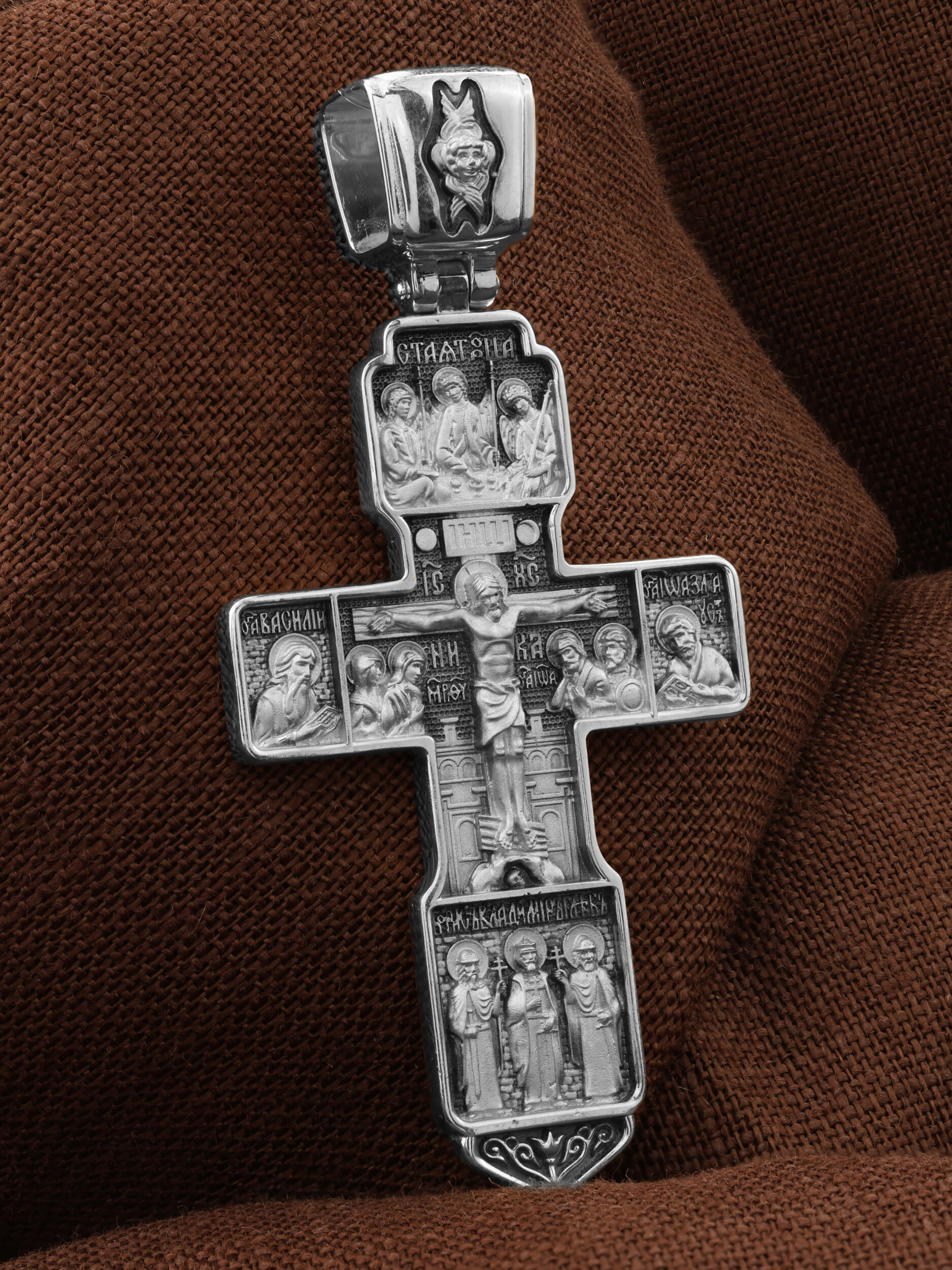 На концах горизонтальной балки креста помещены образы вселенских святителей и творцов литургии Василия Великого и Иоанна Златоуста. В кулонном кольце изображены райские врата с их стражем — Херувимом. Врата, которые открылись благодаря крестной жертве Христа.