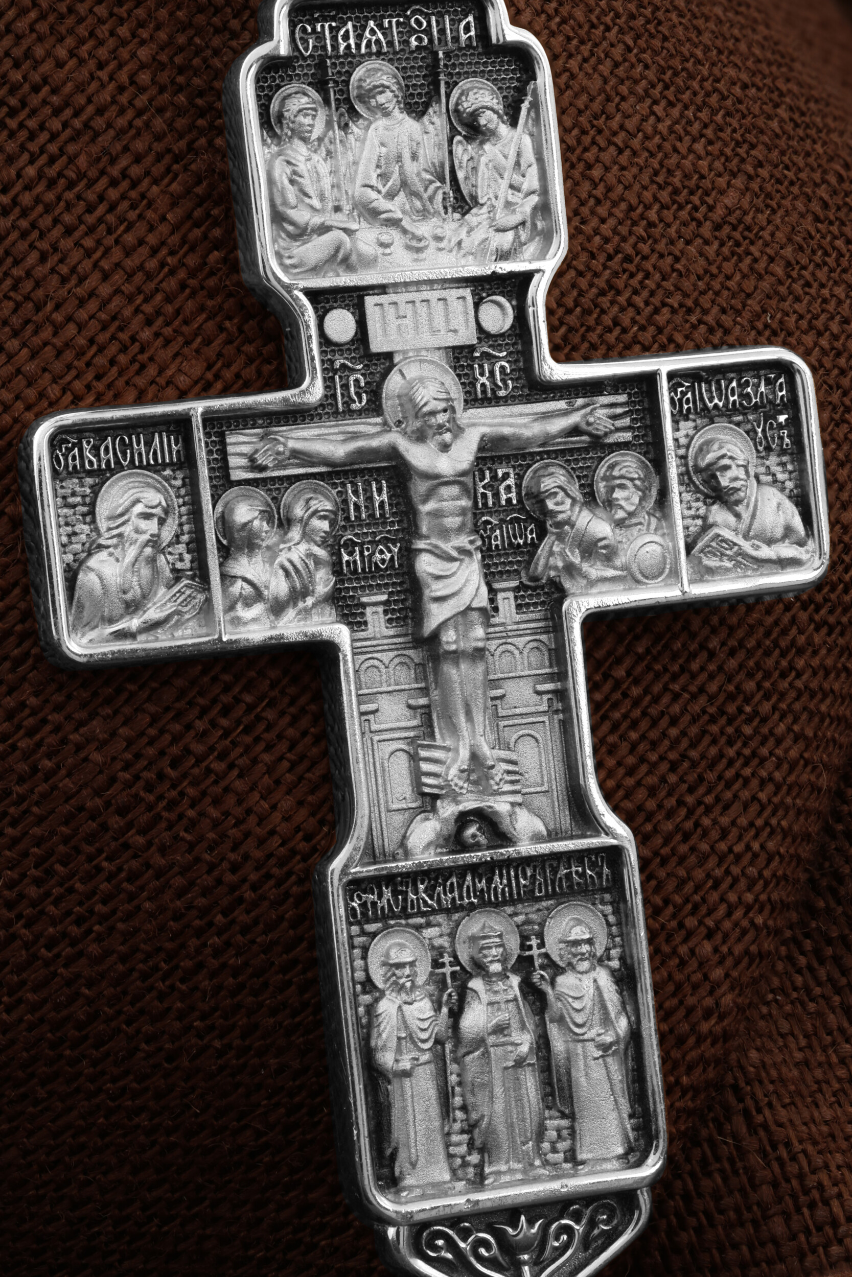 В нижней части креста изображены образы первых русских святых князей-мучеников — Бориса (князь ростовский) и Глеба (князь муромский) и святого равноапостольного князя Владимира. Страстотерпцам Борису и Глебу молятся об умиротворении Отечества, о добром нраве властей и правителей, о сохранении от междоусобицы, о даровании мужества перед лицом смертельной опасности. С Борисом и Глебом неразрывно связан образ их отца — святого равноапостольного князя Владимира, который также почитается как защитник и покровитель Русской Земли и Церкви. В молитвах его называют «отец русский» или «отец всея Руси».