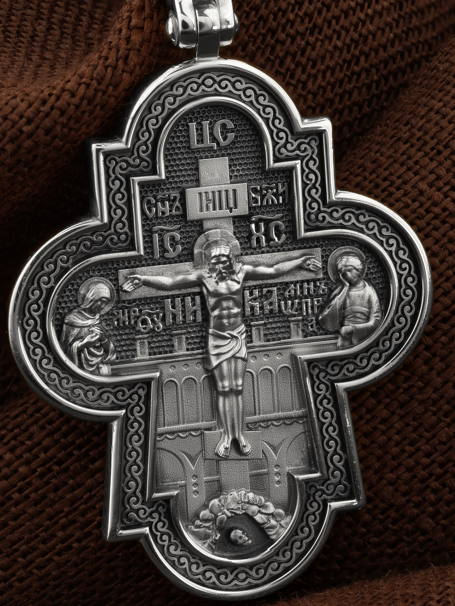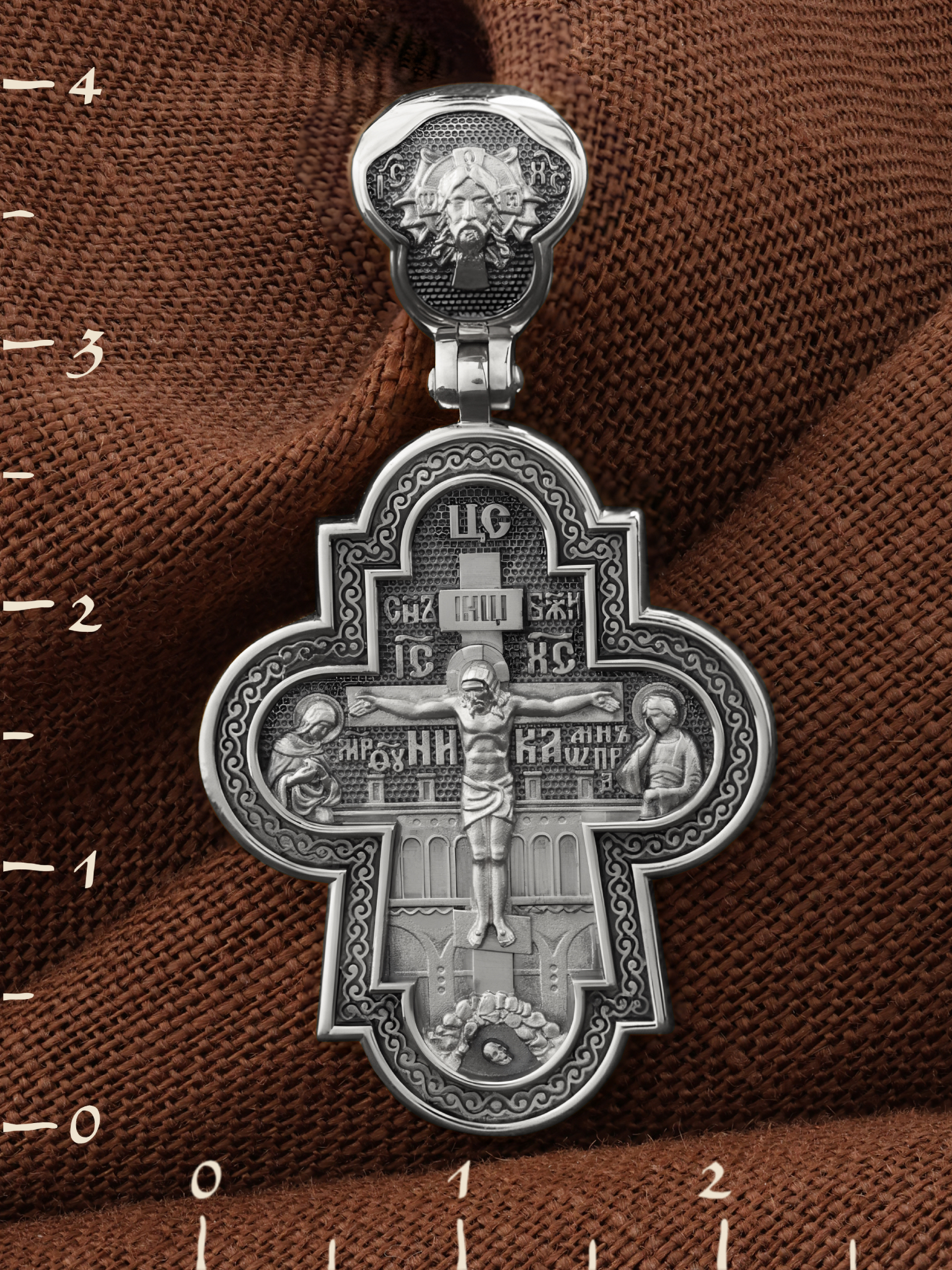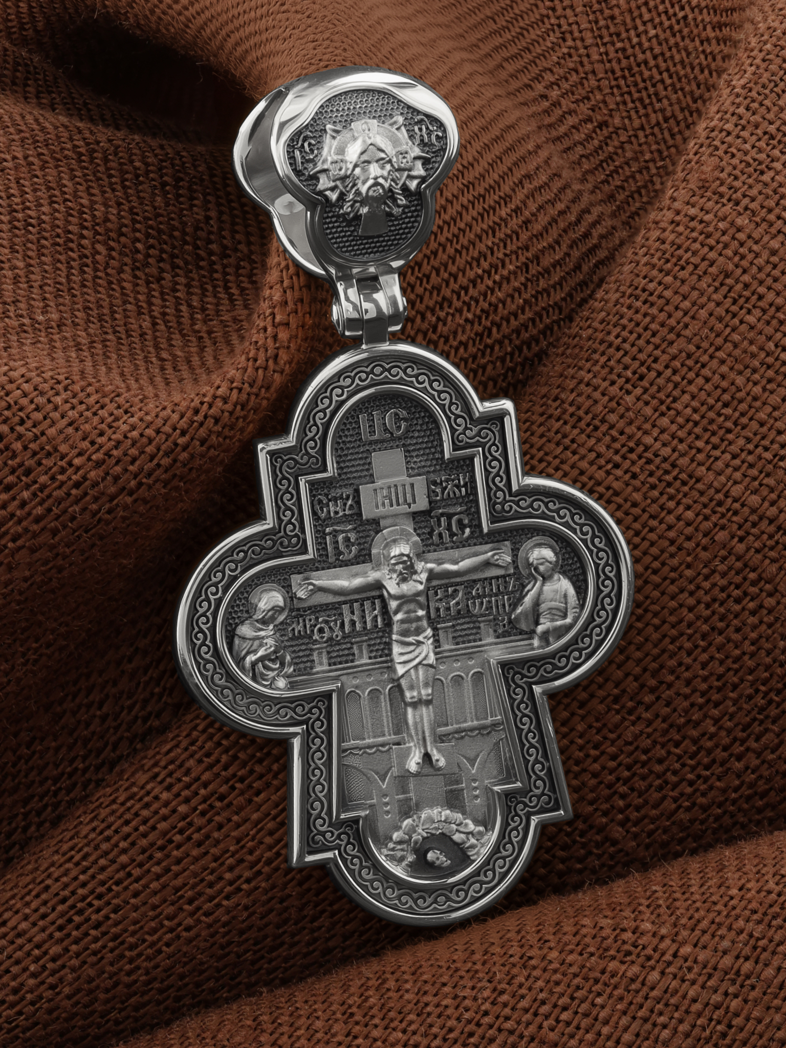 На лицевой стороне креста изображено Распятие Господа и Спасителя нашего Иисуса Христа, отдавшего Себя на смерть, для искупления грехов мира. Крест является символом жертвенной любви Всеблагого Бога к падшим людям, всепобеждающим духовным оружием христиан, основанием и средоточием церковной жизни. Господь сказал: кто хочет идти за Мною, отвергнись себя, и возьми крест свой, и следуй за Мною. (Мк. 8: 34). Над Распятием помещена надпись «Царь Славы». На верхней табличке, выше головы Иисуса, расположена надпись, составленная Понтием Пилатом — «IНЦI». Она означает «Иисус Назорей, Царь Иудейский». Надпись «IC» «ХC», означает Иисус Христос, помещается на разных сторонах поперечной перекладины креста. Возвышение, на котором стоит Крест, символизирует гору Голгофу, на которой произошло Распятие. Под подножием Креста изображена покоящаяся голова (череп) Адама. На кулонном кольце изображен Нерукотворный образ Господа и Спасителя нашего Иисуса Христа, чудесно отпечатавшийся на плате, которым Христос вытер свой лик.