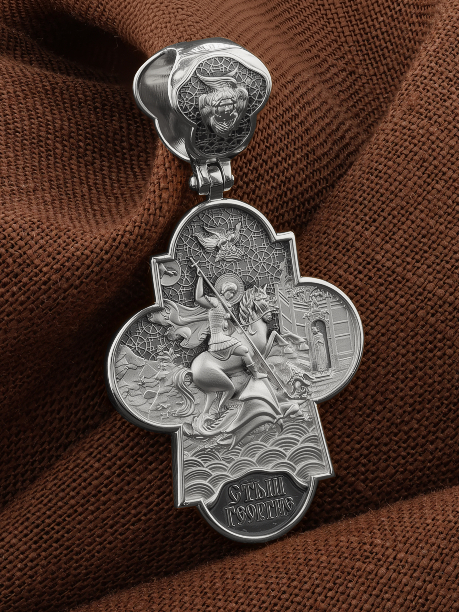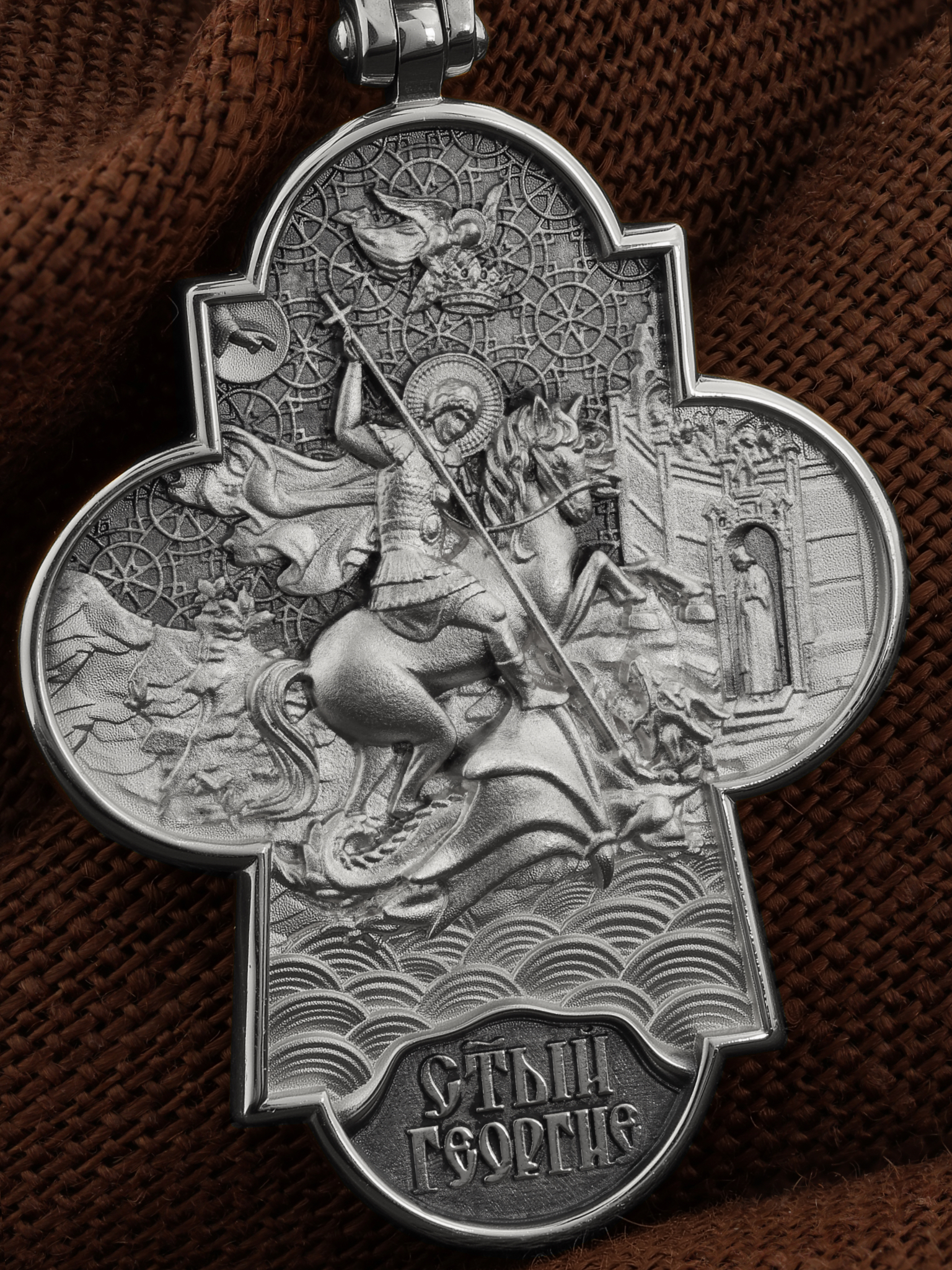 На оборотной стороне креста помещено изображение Святого Великомученика Георгия Победоносца — одного из самых почитаемых и удивительных святых. Георгий родился в Каппадокии (Малая Азия) в семье богатых и знатных горожан. Юношей поступил на службу к римскому императору Диоклетиану, за отличное знание военного дела и проявленную в боях и походах храбрость был приближен к императору и удостоен высокого воинского звания. Во время начавшихся гонений на христиан, перешел на сторону гонимых и, отвергнув человеческий страх, стал ярым проповедником учения Христа. Мучители подвергли опального воеводу жесточайшим восьмидневным пыткам и казнили его (обезглавили) в возрасте около тридцати лет в 303 году. Георгий изображен как воитель, сидящий на вздыбленном коне и поражающий копьем огнедышащего змея. Слева над образом изображена благословляющая Божия десница. Над святым изображен ангел возлагающий на него венец мученика. Змей символизирует собою сатанинские силы. Молитвами вознесенными к Всевышнему и своей непреклонной верой он смог одолеть чудовище. Святой убил змея, спас царскую дочь, принесенную в жертву, и жителей города, их души от влияния дьявола, породив в них надежду и веру в Господа, призывая людей принять христианскую веру. На кулонном кольце изображен шестикрылый Ангел — Серафим.
