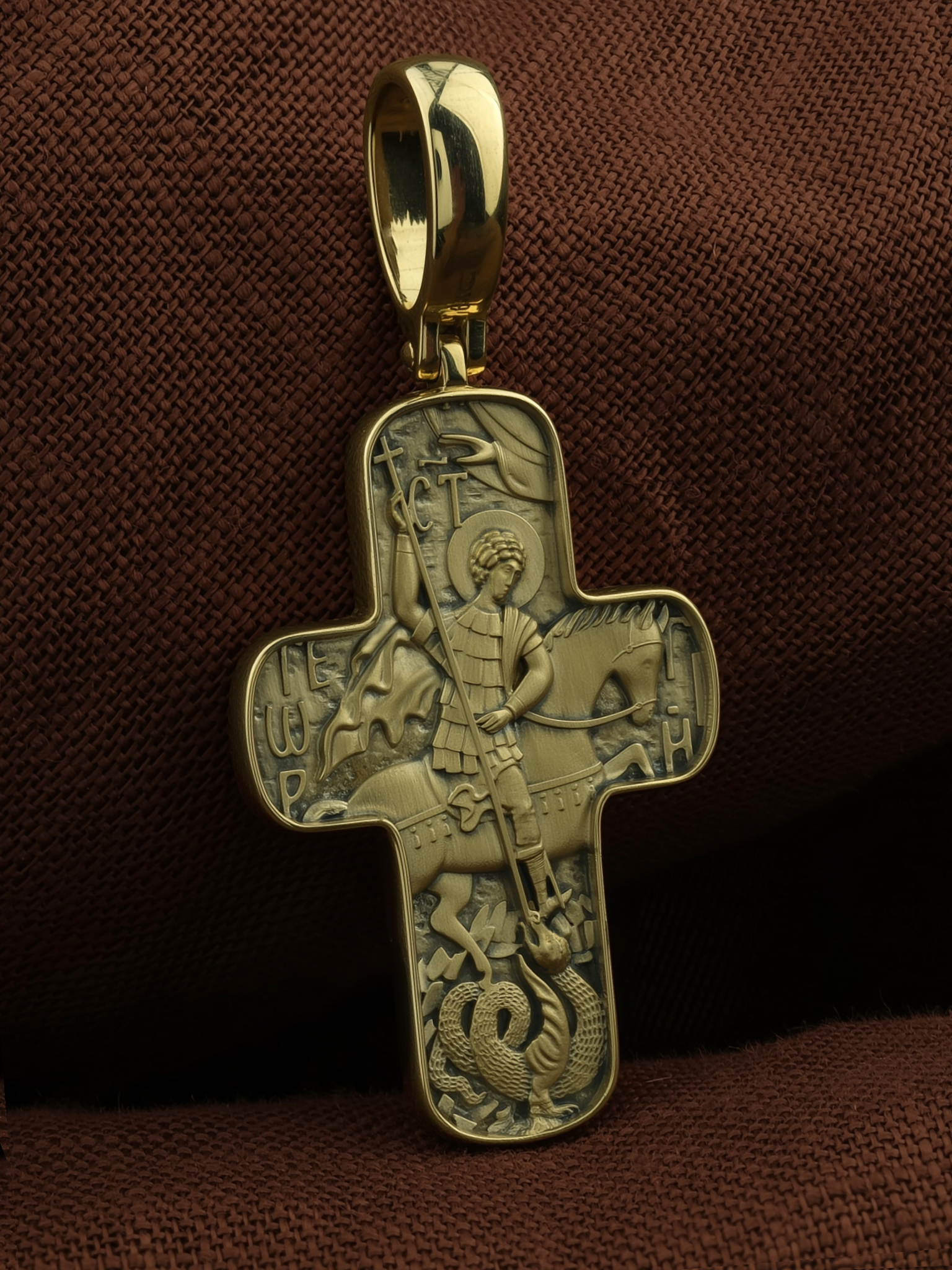 Основой композиции оборотной стороны креста является изображение Святого Великомученика Георгия Победоносца — одного из самых почитаемых и удивительных святых. На Руси он известен как Юрий или Егорий, покровитель воинов, помощник в крестьянском труде. На образке он изображен как воитель, сидящий на коне и поражающий копьем огнедышащего змея. Змей символизирует собою сатанинские силы. Молитвами вознесенными к Всевышнему и своей непреклонной верой он смог одолеть чудовище.. Над образом изображена благословляющая Божия десница.