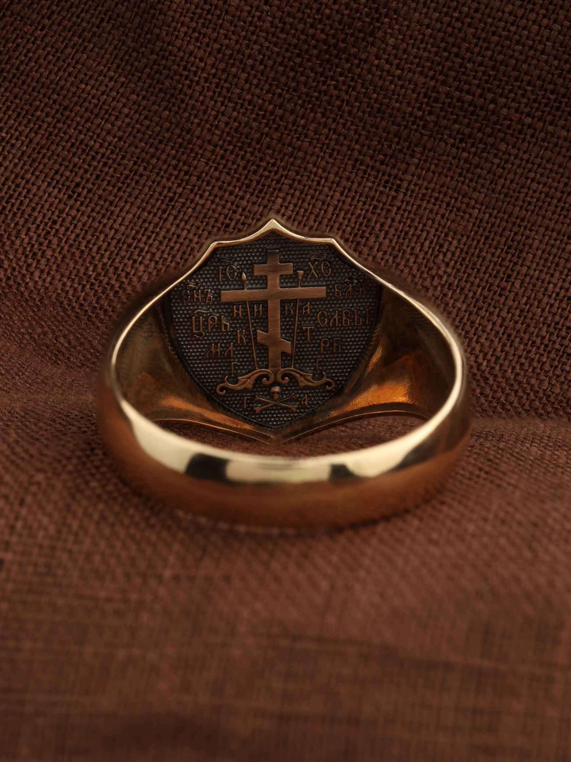 Кольцо «Архангел Михаил» выполнено в древних христианских традициях. Архангел Михаил — верный служитель Божий, который низринул с Неба возгордившегося денницу с другими павшими духами. В Православии его называют Архистратигом, что означает глава святого воинства Ангелов и Архангелов. Архангел Михаил изображен в воинственном виде с огненным мечом в правой руке и щитом в левой. Архангел почитается как покровитель воинов и всех верных Богу и ведущих борьбу против сил зла, борец против ересей, а также защитник душ умерших, страж райских врат. С древних времен прославлен своими чудесами Архангел Михаил на Руси. Примеров явления и помощи Архистратига Михаила в русской истории бессчетно. Архангел Михаил не перестает ратоборствовать за славу Творца и Господа всяческих, за дело спасения рода человеческого, за церковь и чад ее. И, согласно, Откровению Иоанна Богослова во время последней битвы небесных и дьявольских сил Михаил и его ангелы опять низвергнут Люцифера вместе с его войском: «Михаил и Ангелы его воевали против дракона, и дракон и ангелы его воевали [против них], но не устояли, и не нашлось уже для них места на небе. И низвержен был великий дракон, древний змий, называемый диаволом и сатаною, обольщающий всю вселенную, низвержен на землю, и ангелы его низвержены с ним» (Откр.12:7−9).