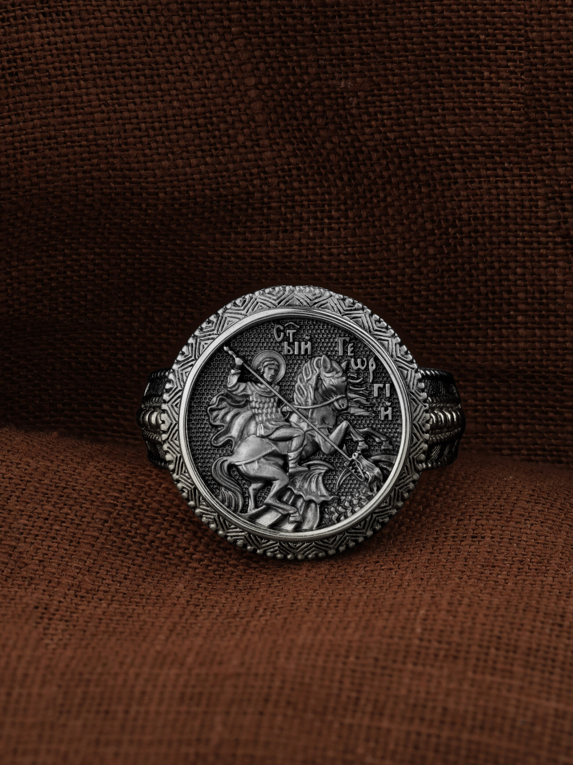 Кольцо «Святой Великомученик Георгий Победоносц» выполнено в древних христианских традициях. Основой композиции является изображение Святого Великомученика Георгия Победоносца — одного из самых почитаемых и удивительных святых. Георгий родился в Каппадокии (Малая Азия) в семье богатых и знатных горожан. Юношей поступил на службу к римскому императору Диоклетиану, за отличное знание военного дела и проявленную в боях и походах храбрость был приближен к императору и удостоен высокого воинского звания. Во время начавшихся гонений на христиан, перешел на сторону гонимых и, отвергнув человеческий страх, стал ярым проповедником учения Христа. Мучители подвергли опального воеводу жесточайшим восьмидневным пыткам и казнили его (обезглавили) в возрасте около тридцати лет в 303 году. На Руси он известен как Юрий или Егорий, заступник для верующих, чья жизнь имеет какое-либо отношение к военным делам, помощник в крестьянском труде. Георгий изображен как воитель, сидящий на вздыбленном коне и поражающий копьем огнедышащего змея. Справа над образом изображена благословляющая Божия десница. Змей символизирует собою сатанинские силы. Молитвами вознесенными к Всевышнему и своей непреклонной верой он смог одолеть чудовище. Святой убил змея, спас царскую дочь, принесенную в жертву, и жителей города, их души от влияния дьявола, породив в них надежду и веру в Господа, призывая людей принять христианскую веру.