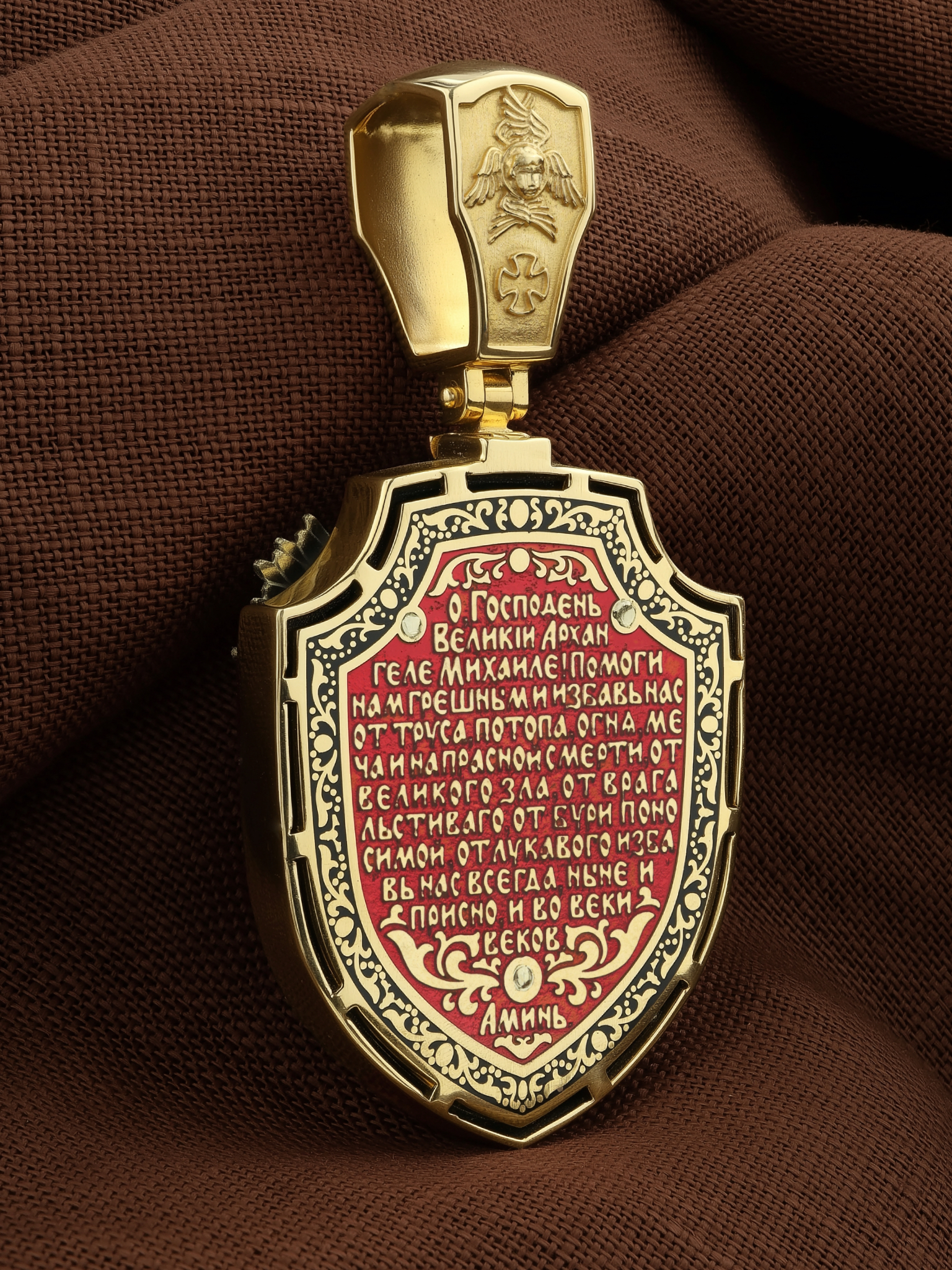 На оборотной стороне образка написаны слова молитвы: «О, Господень Великий архангеле Михаиле! Помоги нам грешным и избавь нас от труса, потопа, огня, меча и напрасной смерти, от великого зла, от врага льстиваго, от бури поносимой, от лукавого избави нас навсегда, ныне и присно и во веки веков. Аминь.» На кулонном кольце изображен шестикрылый Серафим.