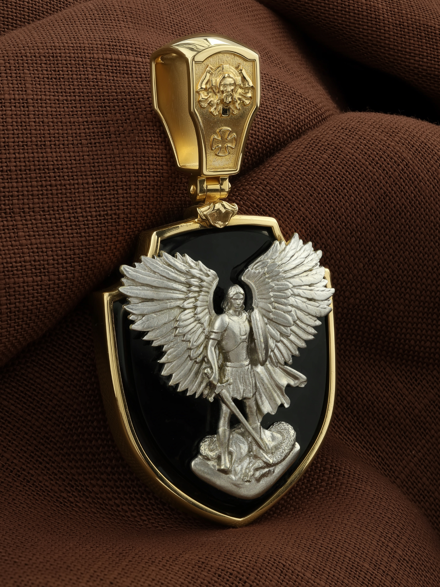 На лицевой стороне образка размещено изображение Архангела Михаила — верного служителя Божия, который низринул с Неба возгордившегося денницу с другими павшими духами. В Православии его называют Архистратигом, что означает глава святого воинства Ангелов и Архангелов. Образок сделан в виде воинского щита. Архангел Михаил изображен в воинственном виде с огненным мечом в правой руке и щитом в левой поражающим змея. Змей символизирует собою сатанинские силы. Архангел почитается, как покровитель воинов и всех верных Богу и ведущих борьбу против сил зла, борец против ересей, а также защитник душ умерших, страж райских врат. С древних времен прославлен своими чудесами Архангел Михаил на Руси. Примеров явления и помощи Архистратига Михаила в русской истории бессчетно. Архангел Михаил не перестает ратоборствовать за славу Творца и Господа всяческих, за дело спасения рода человеческого, за церковь и чад ее. И, согласно, Откровению Иоанна Богослова во время последней битвы небесных и дьявольских сил Михаил и его ангелы опять низвергнут люцифера вместе с его войском: «Михаил и Ангелы его воевали против дракона, и дракон и ангелы его воевали [против них], но не устояли, и не нашлось уже для них места на небе. И низвержен был великий дракон, древний змий, называемый диаволом и сатаною, обольщающий всю вселенную, низвержен на землю, и ангелы его низвержены с ним» (Откр.12:7−9). На кулонном кольце изображен Нерукотворный образ Господа и Спасителя нашего Иисуса Христа, чудесно отпечатавшийся на плате, которым Христос вытер свой лик.