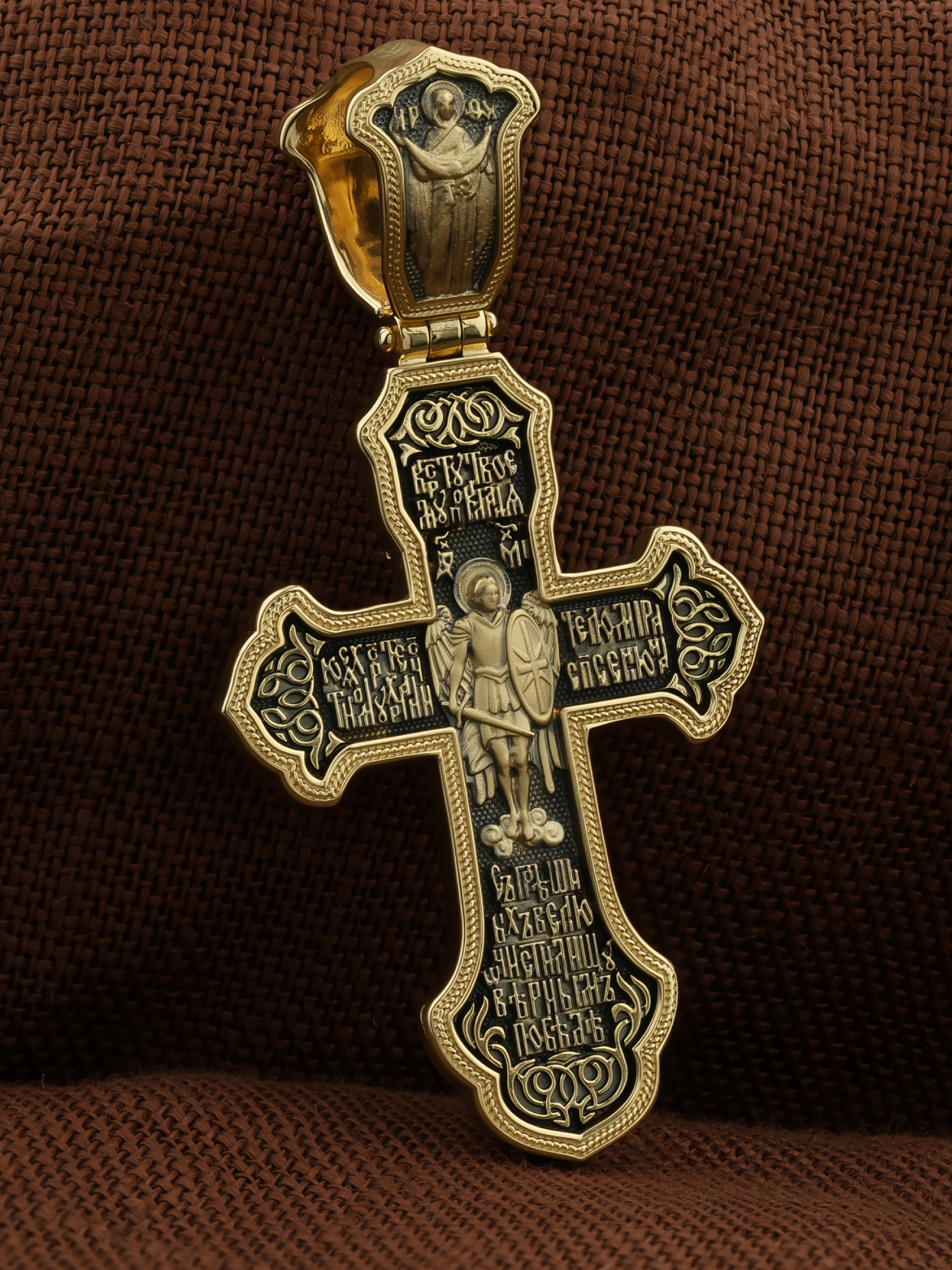 В центре оборотной стороне креста помещен образ Архангела Михаила — верного служителя Божия, который низринул с Неба возгордившегося денницу с другими павшими духами. Он изображен в воинственном виде с огненным мечом в правой руке и щитом в левой. В Православии его называют Архистратигом, что означает глава святого воинства Ангелов и Архангелов. Вокруг образа размещена молитва: «Кресту твоему поклоняемся, Христе, честному хранителю мира, спасения нас грешных, велию очистилищу, верным победе». На кулонной кольце изображена икона Божией Матери «Покров Пресвятой Богородицы». Праздник Покрова Пресвятой Богородицы пришел на Русь в XII веке из Византии и стал одним из самых почитаемых. Богородица простирает Свой молитвенный покров над всеми православными христианами и умоляет Сына своего о даровании вечного спасения каждому человеку.