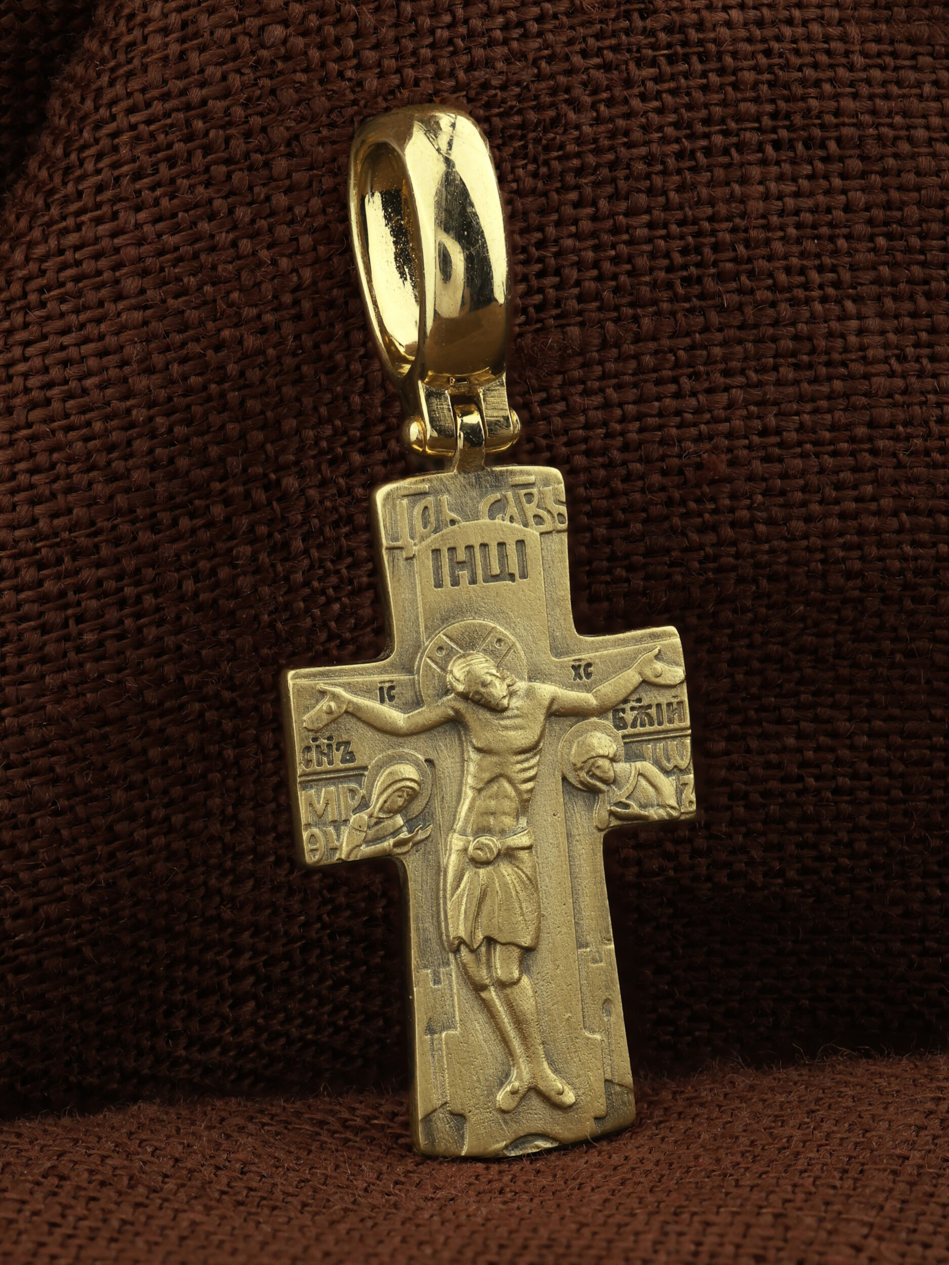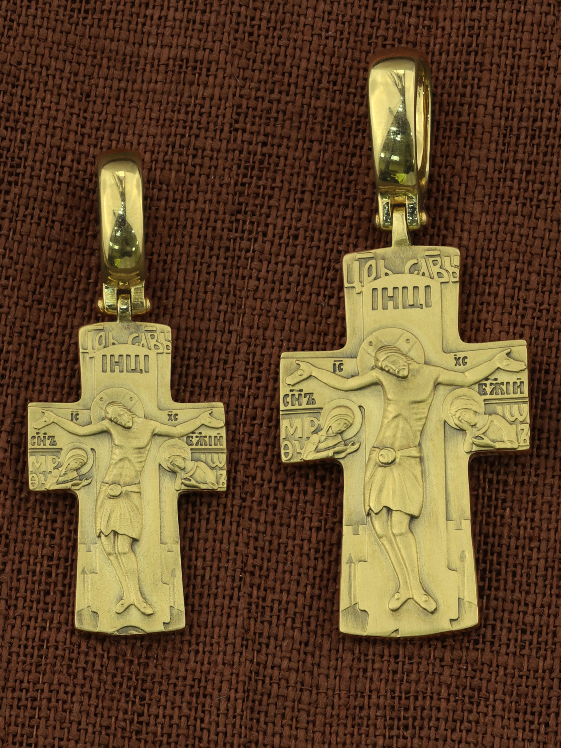 На лицевой стороне креста изображено Распятие Господа и Спасителя нашего Иисуса Христа, отдавшего Себя на смерть, для искупления грехов мира. Крест является символом жертвенной любви Всеблагого Бога к падшим людям, всепобеждающим духовным оружием христиан, основанием и средоточием церковной жизни. Над вершиной Распятия помещена надпись «Царь Славы». На верхней табличке, выше головы Иисуса, расположена надпись, составленная Понтием Пилатом — «IНЦI». Она означает «Иисус Назорей, Царь Иудейский». Распятие сопровождается каноническими надписями. Надпись «IC» «ХC», означает Иисус Христос и словосочетание «СЫН БОЖИЙ», что означает божественную природу Иисуса Христа, помещаются на разных сторонах поперечной перекладины креста. Слева от Распятия изображена Пресвятая Богородица, справа — апостол и евангелист Иоанн Богослов, один из ближайших учеников Иисуса Христа. Вдоль креста изображены копие сотника Лонгина и трость с губкой. За Распятием высится Иерусалимская стена, в знак того, что Господь был распят вне стен города.