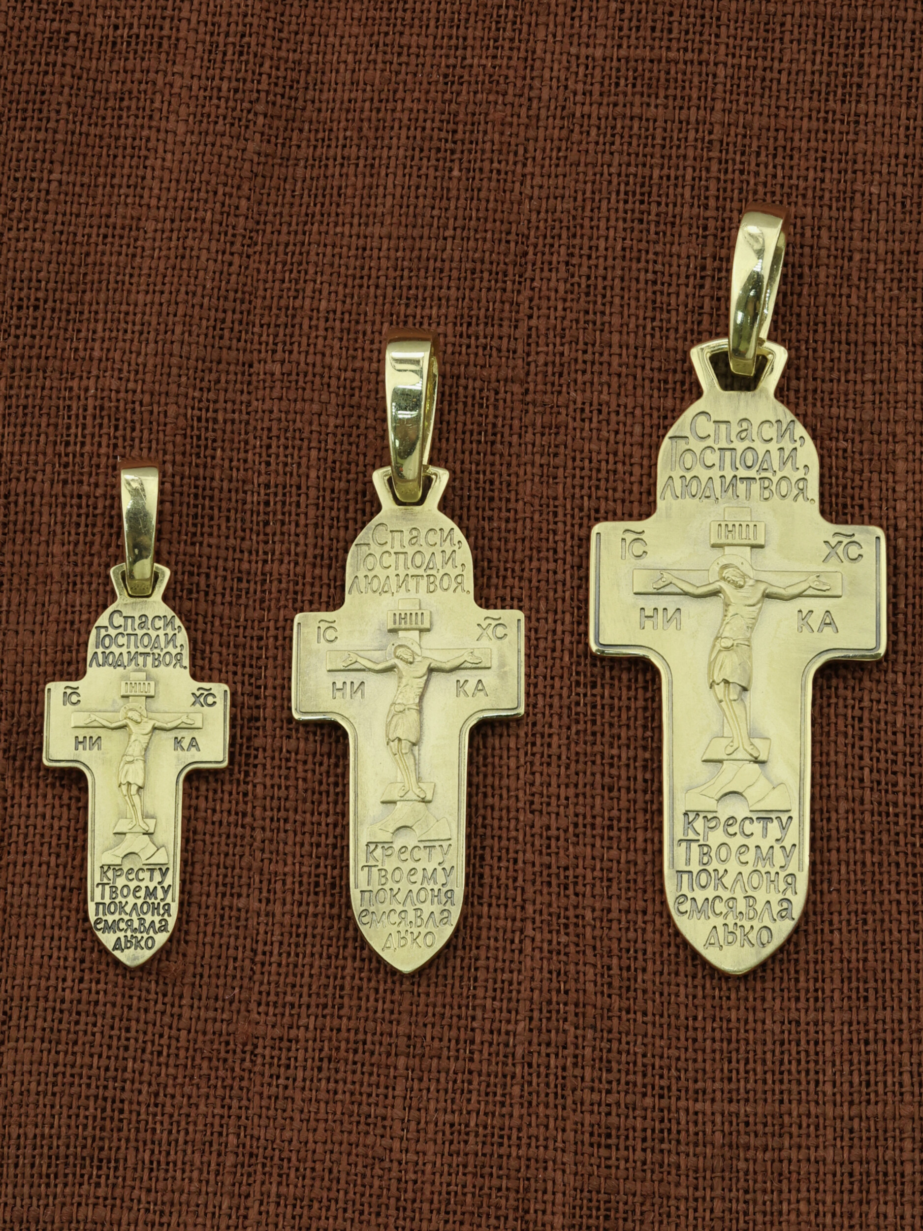 На лицевой стороне креста изображено Распятие Господа и Спасителя нашего Иисуса Христа. Крест- символ спасения и искупления рода человеческого, знамение победы над смертью и адом. Иисус Христос, как искупительная жертва освобождения человечества от власти греха, умер крестной смертью и в третий день воскрес. На верхней табличке, выше головы Иисуса, расположена надпись, составленная Понтием Пилатом — «IНЦI». Она означает «Иисус Назорей, Царь Иудейский». Надпись «IC» «ХC», означает Иисус Христос, помещается на разных сторонах поперечной перекладины креста. Под ней помещено слово «НIКА», что означает Победитель. Крест стоит на горе камней, символизирующих Голгофу.